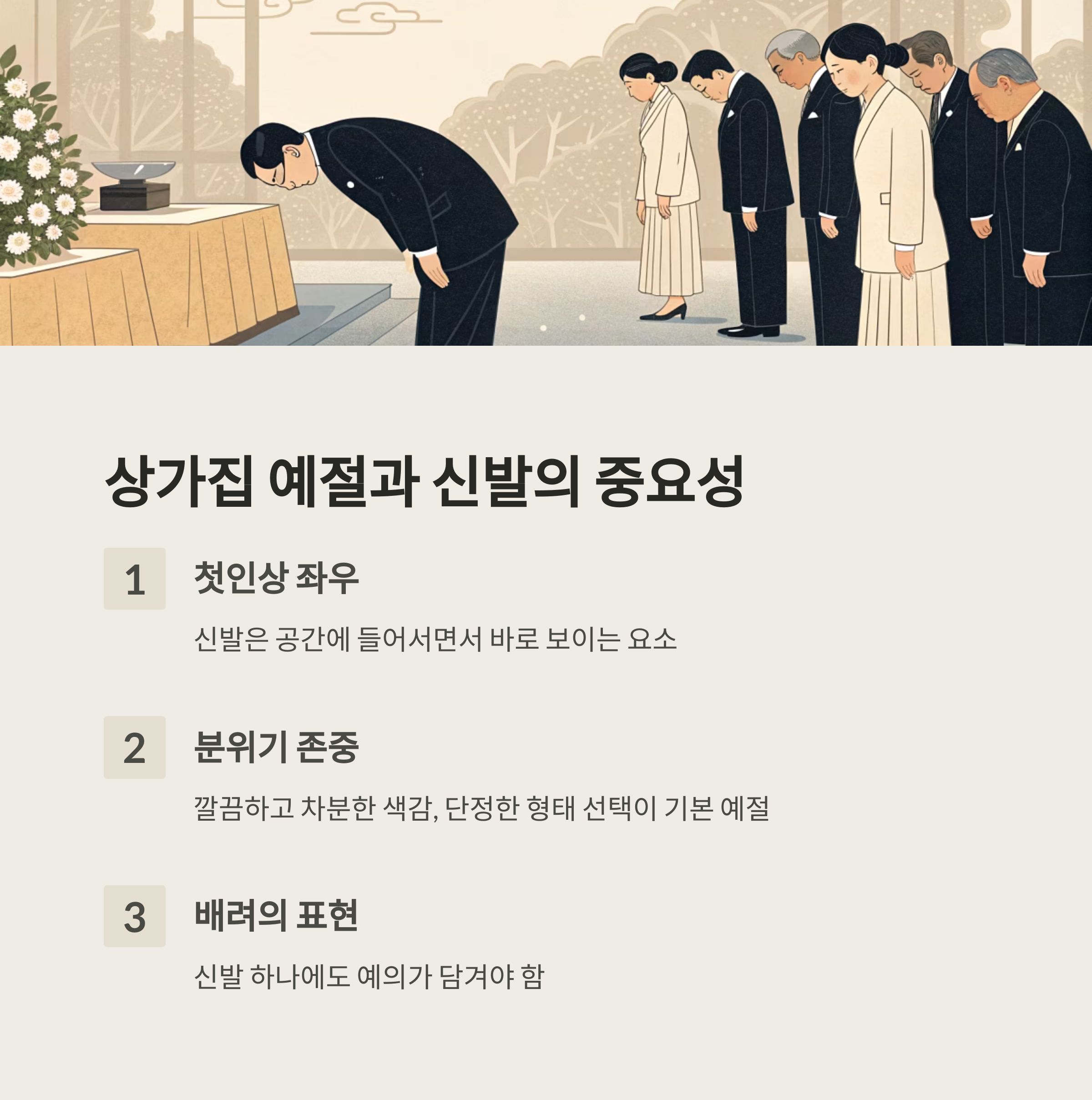 신발을 벗고 들어가는 문화 특성상, 실내에서 다른 조문객들과 함께 대기하거나 분향하는 동안 신발은 문밖에 가지런히 놓이게 되죠. 이때 화려하거나 지나치게 캐주얼한 신발은 전체 분위기를 해치고 눈에 띄는 단점이 될 수 있어요.
