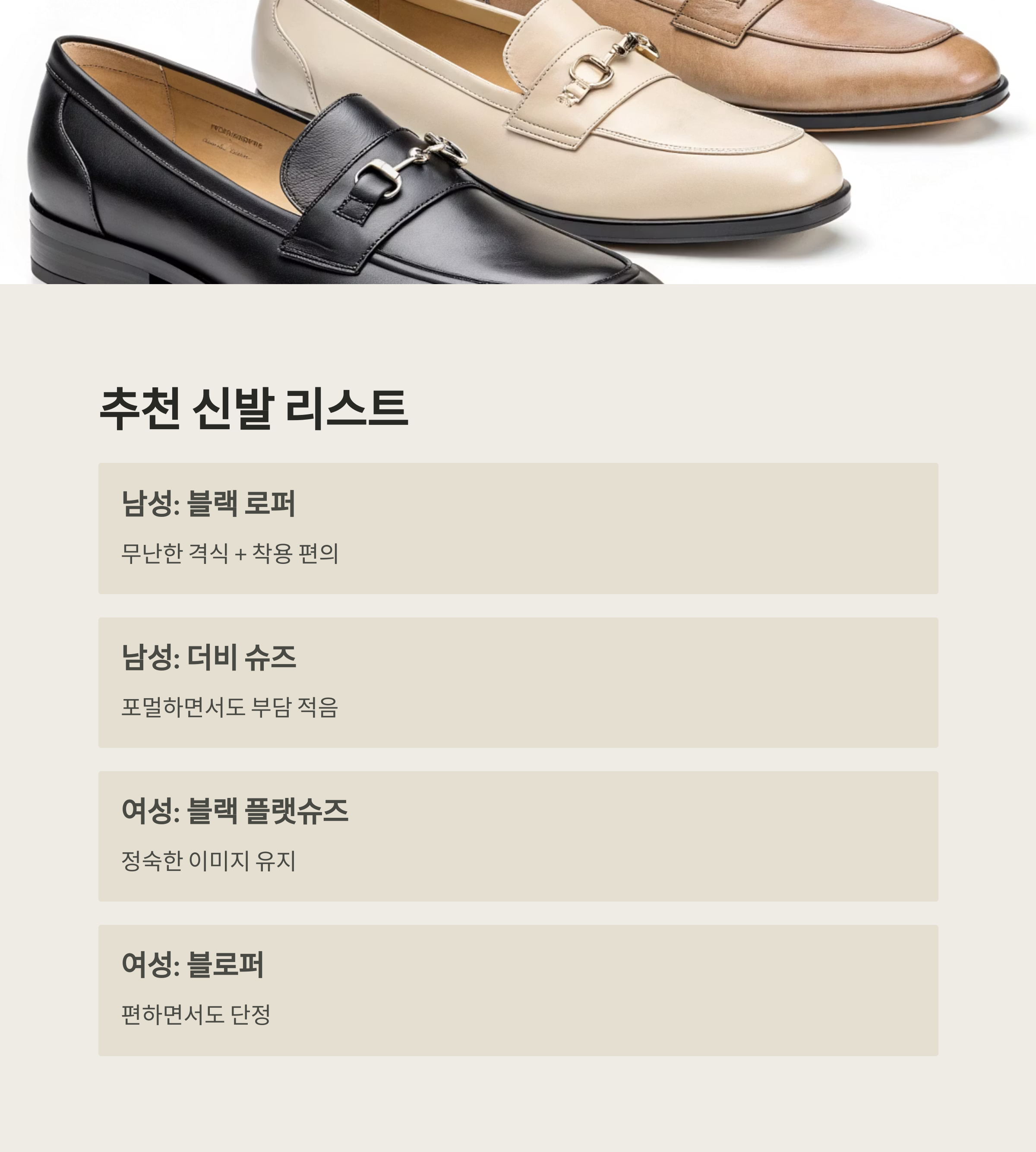 | 남성 | 블랙 로퍼 | 무난한 격식 + 착용 편의 |