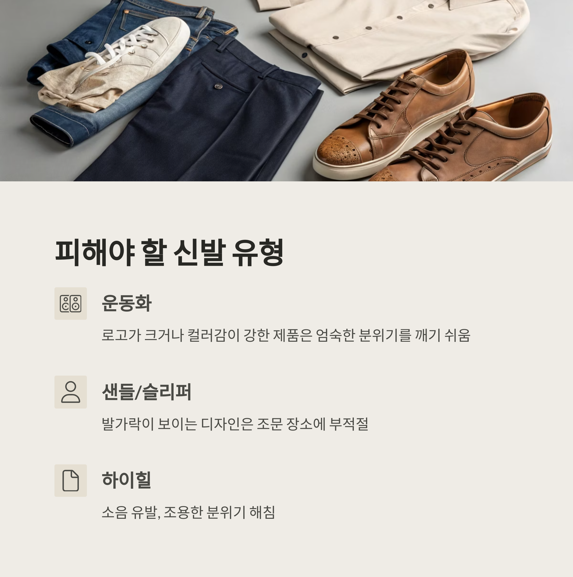 가장 대표적인 예가 바로 운동화예요. 특히 로고가 크거나 컬러감이 강한 제품은 엄숙한 분위기를 깨기 쉬워요. 물론 일부 블랙톤의 무광 운동화는 허용되기도 하지만, 일반적으로는 로퍼나 슬립온이 더 나은 선택이에요.