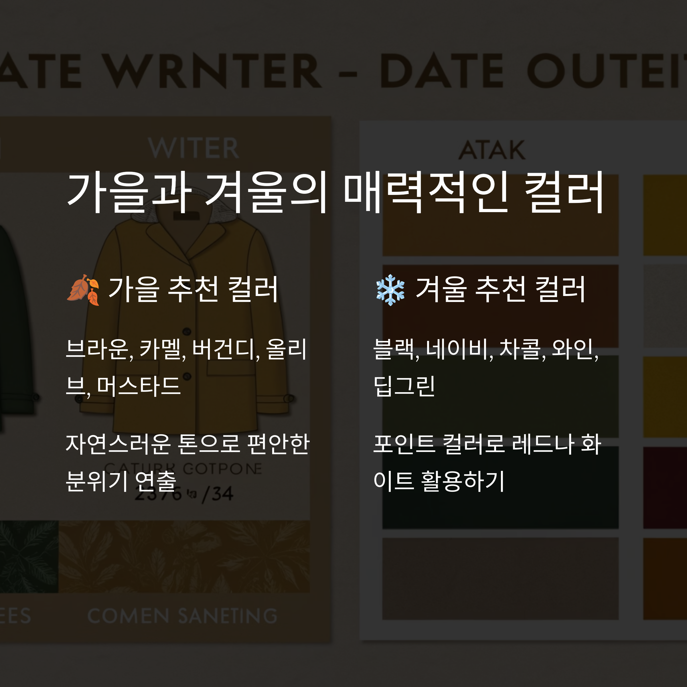 가을은 분위기 있는 계절이에요. 단풍이 들고 공기도 선선해지면서 차분하고 따뜻한 컬러가 잘 어울리는 시기죠. 브라운, 카멜, 버건디, 올리브, 머스타드 톤이 대표적이에요.