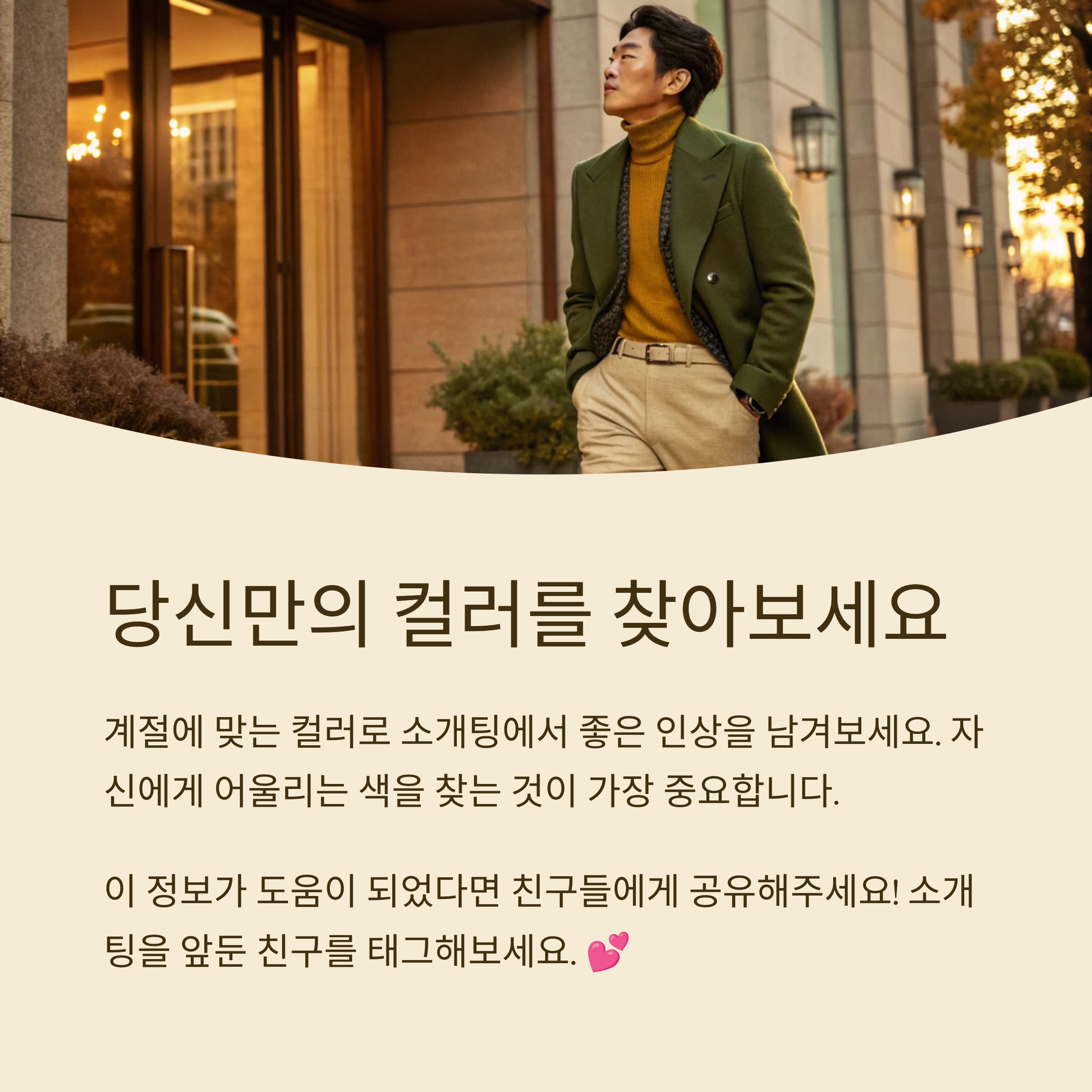 소개팅 장소가 카페나 공원이라면, 이런 내추럴 톤은 정말 잘 어울려요. 상대방이 대화에 집중하면서도 스타일을 세련되게 느낄 수 있어요.🍁