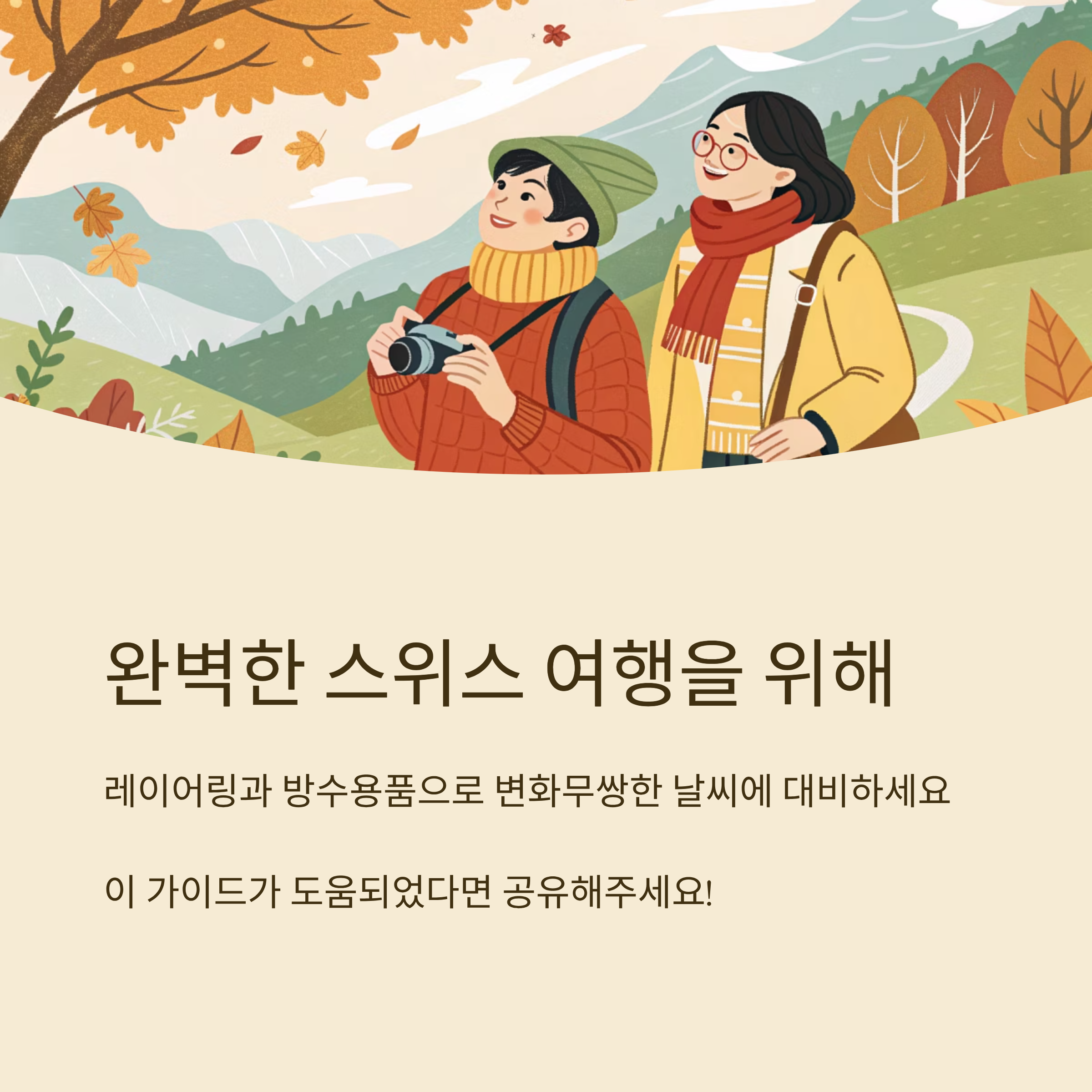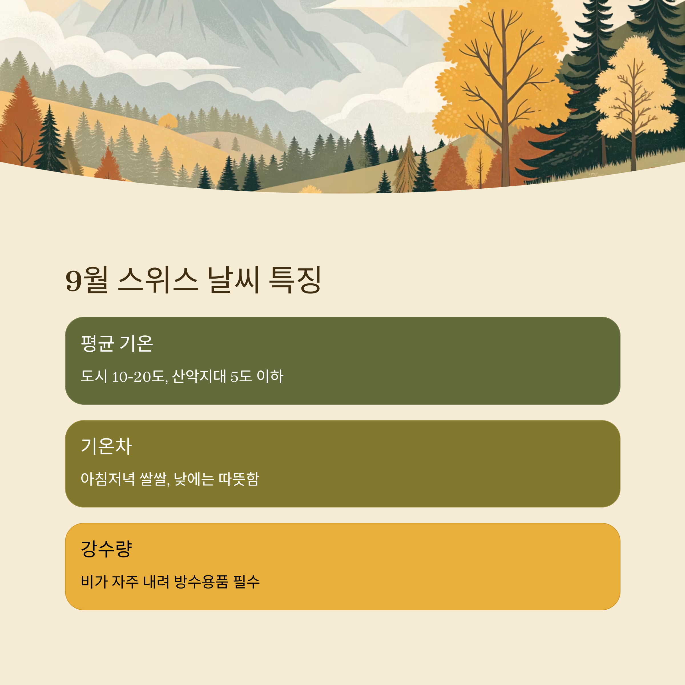 스위스의 9월은 본격적인 가을로 접어드는 시기예요. 낮에는 햇살이 따뜻하지만 아침과 저녁은 제법 쌀쌀해서 기온 차가 크게 느껴질 수 있답니다. 특히 고산지대와 도심의 체감 온도가 달라서 여행 계획을 세울 때 옷차림을 꼼꼼히 준비하는 게 좋아요.