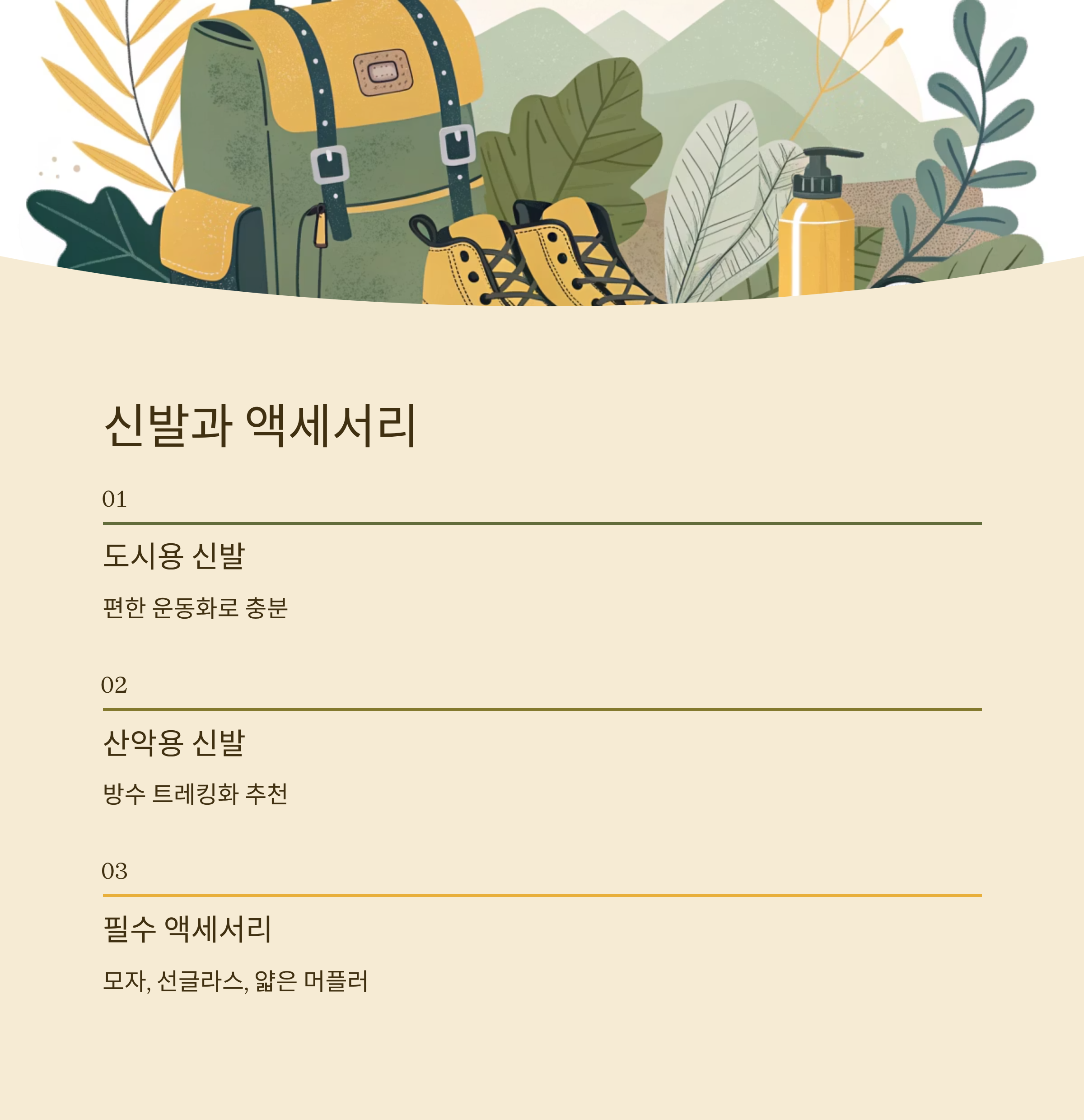 바지는 청바지나 면바지가 가장 무난해요. 너무 얇은 여름 옷은 추위를 느끼기 쉽고, 두꺼운 겨울 옷은 아직 이르니 적절히 중간 두께의 옷을 고르는 게 좋아요. 산행을 계획한다면 등산용 바지도 꼭 챙기세요.
