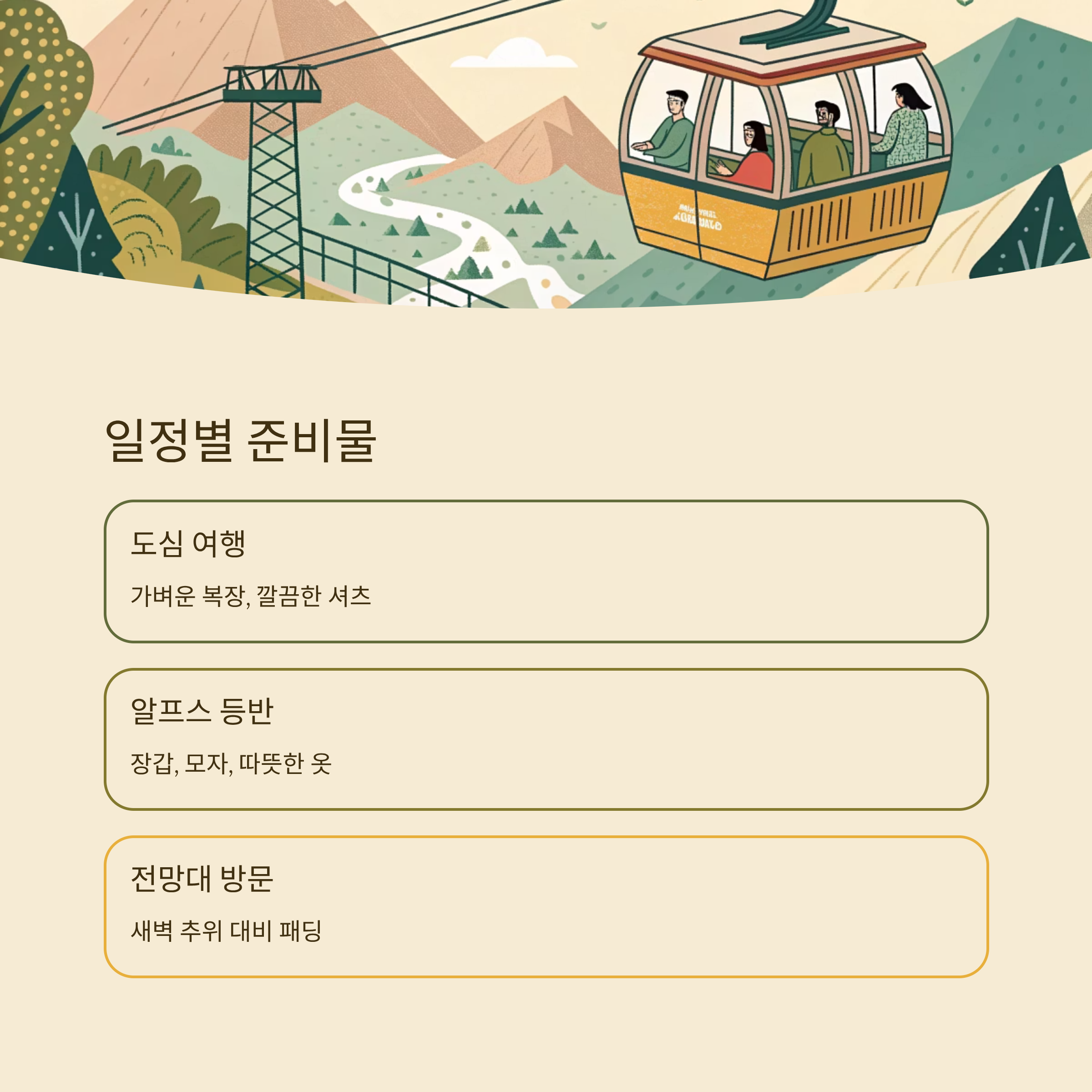 여행 일정이 도심 위주라면 가벼운 복장이 충분하지만, 알프스를 오를 예정이라면 장갑과 모자를 추가하는 게 좋아요. 특히 새벽에 열차를 타고 전망대에 오르면 체감 온도가 한겨울처럼 추워요.
