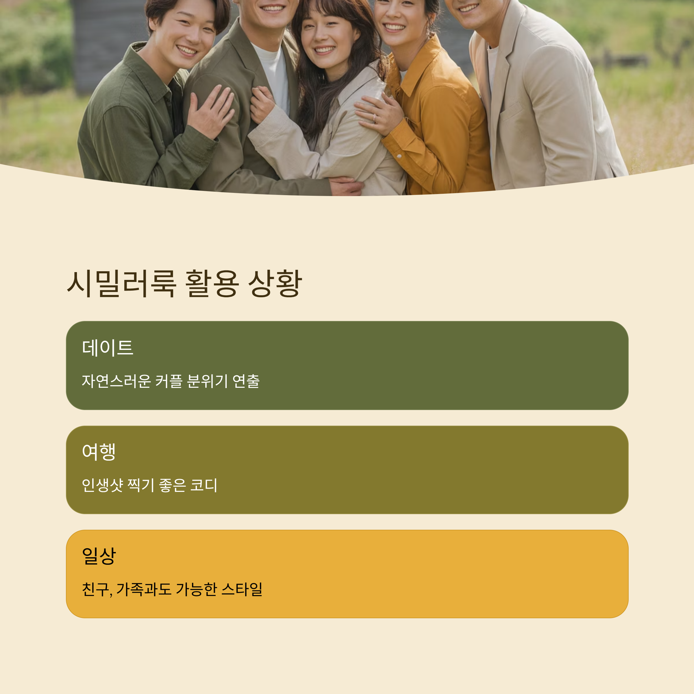 제가 생각했을 때 시밀러룩은 단순히 옷을 맞추는 게 아니라, 관계의 무드와 취향을 반영하는 하나의 감성 표현이라고 느껴져요. 특히 데이트할 때 과하지 않으면서도 서로가 연결되어 있다는 느낌을 주기에 좋아요. 친구, 연인, 심지어 가족과도 멋지게 연출할 수 있고요.