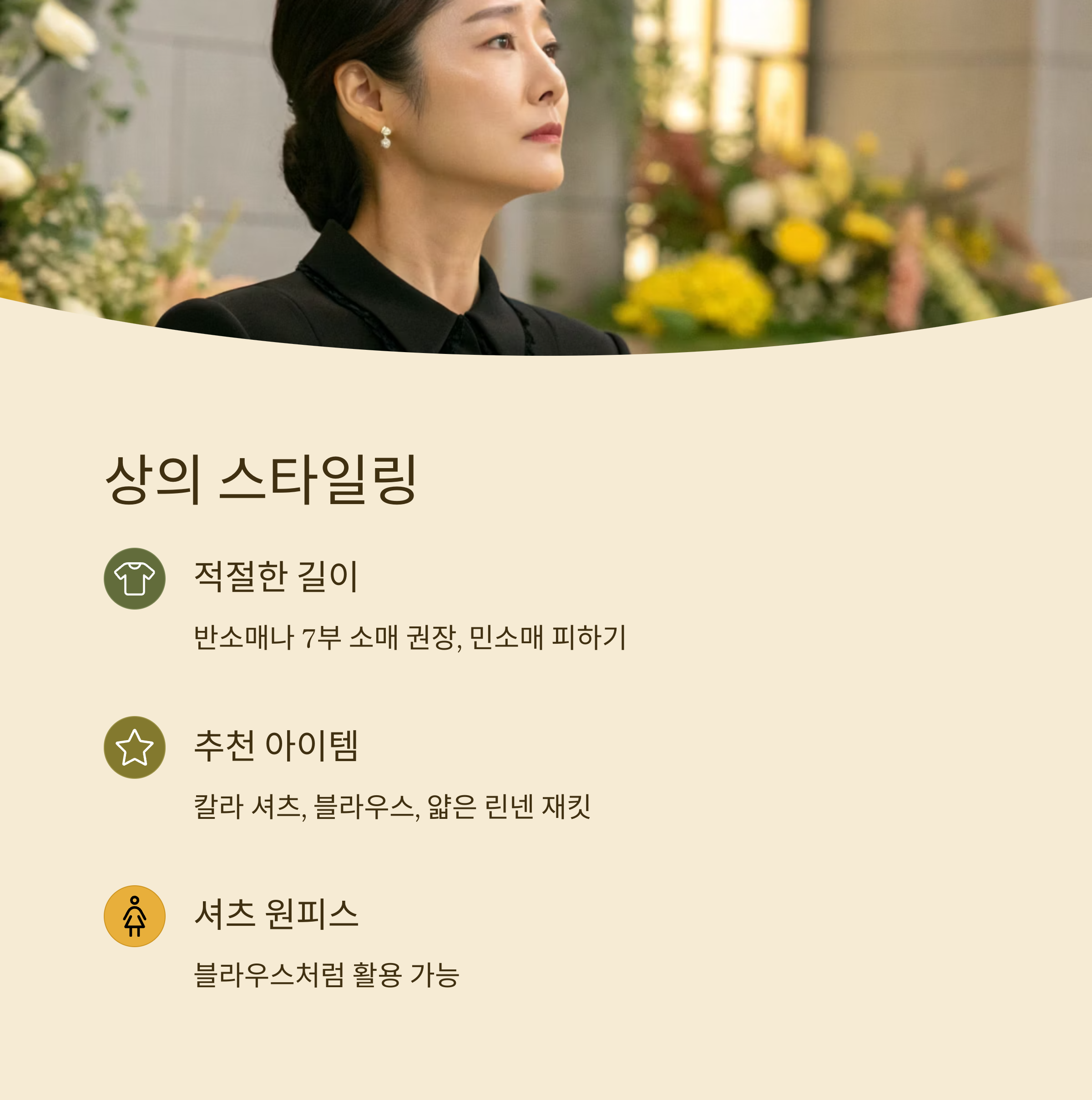 조문룩 상의는 칼라가 있는 셔츠, 블라우스, 혹은 반팔 재킷이 가장 무난해요. 여름이라고 해서 민소매나 오프숄더는 절대 피해야 하고요, 반소매나 7부 소매 정도가 적절해요.