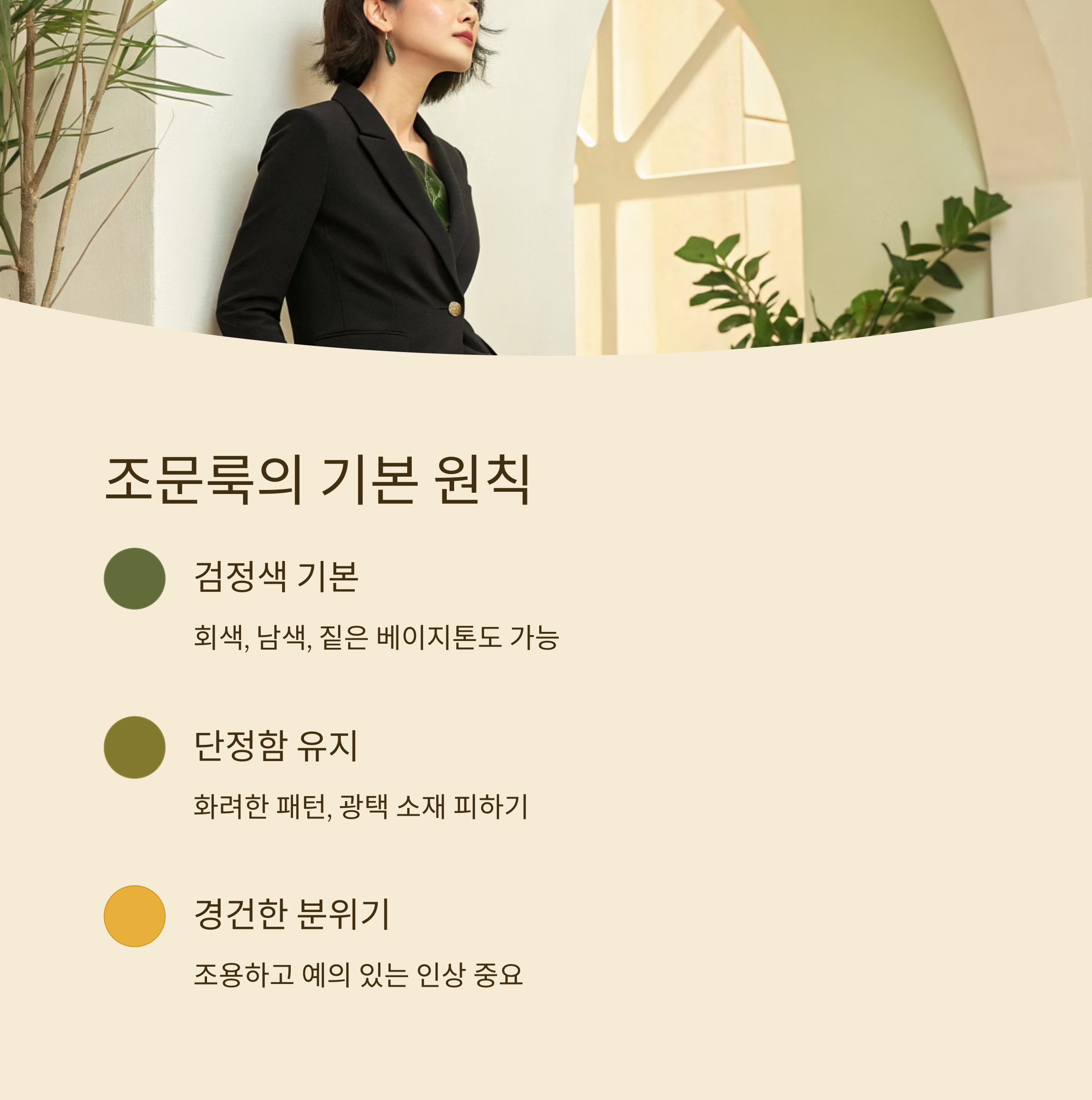 ③ 얇은 블랙 재킷 + 이너 슬리브리스 + 세미 부츠컷 팬츠 + 로우힐: 출근 후 조문이 예정된 경우에 적합한 세미 포멀 조합이에요. 재킷은 실내에서 벗고 착용할 수 있어서 활용도가 높아요.