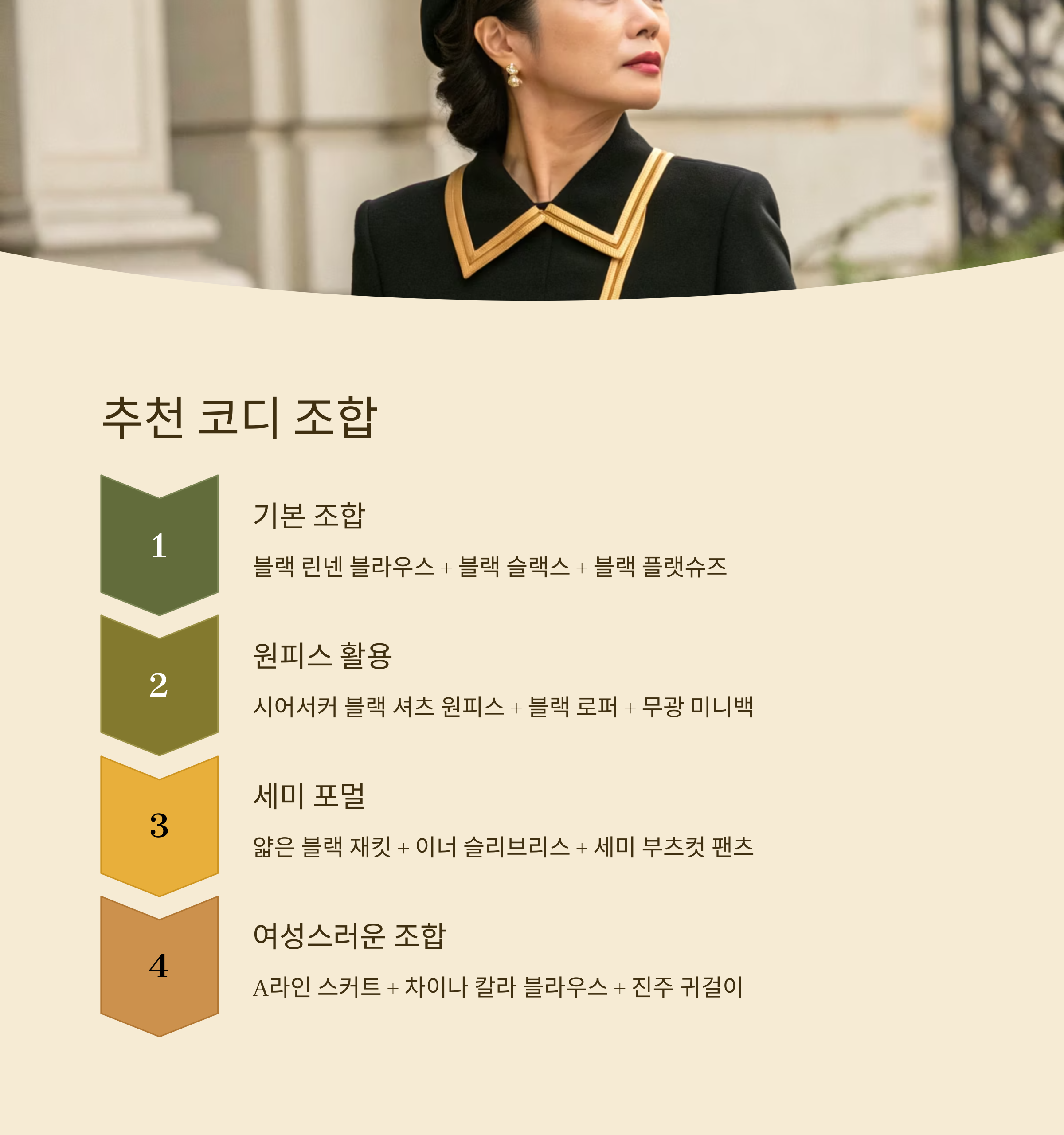 ① 블랙 린넨 블라우스 + 블랙 슬랙스 + 블랙 플랫슈즈: 가장 기본적이고 격식 있는 조합이에요. 열기를 줄이면서도 정중한 분위기를 연출할 수 있어요.