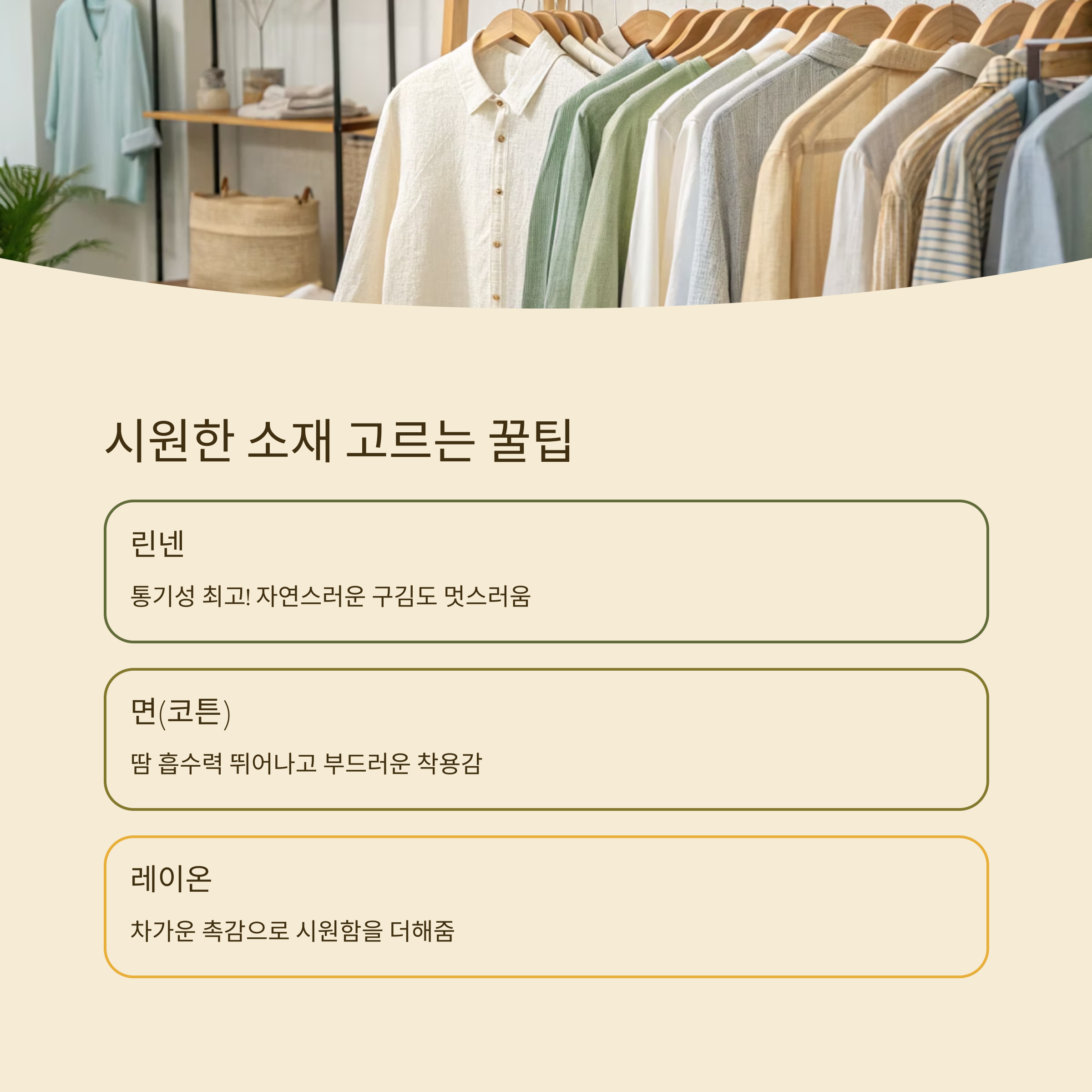 계속해서 이어지는 섹션에서는 '시원한 소재 고르는 팁'을 다룰게요. 여름에는 어떤 원단이 좋을지, 무더위 속에서도 뽀송한 스타일을 유지하는 법 알려줄게요! ⛱️