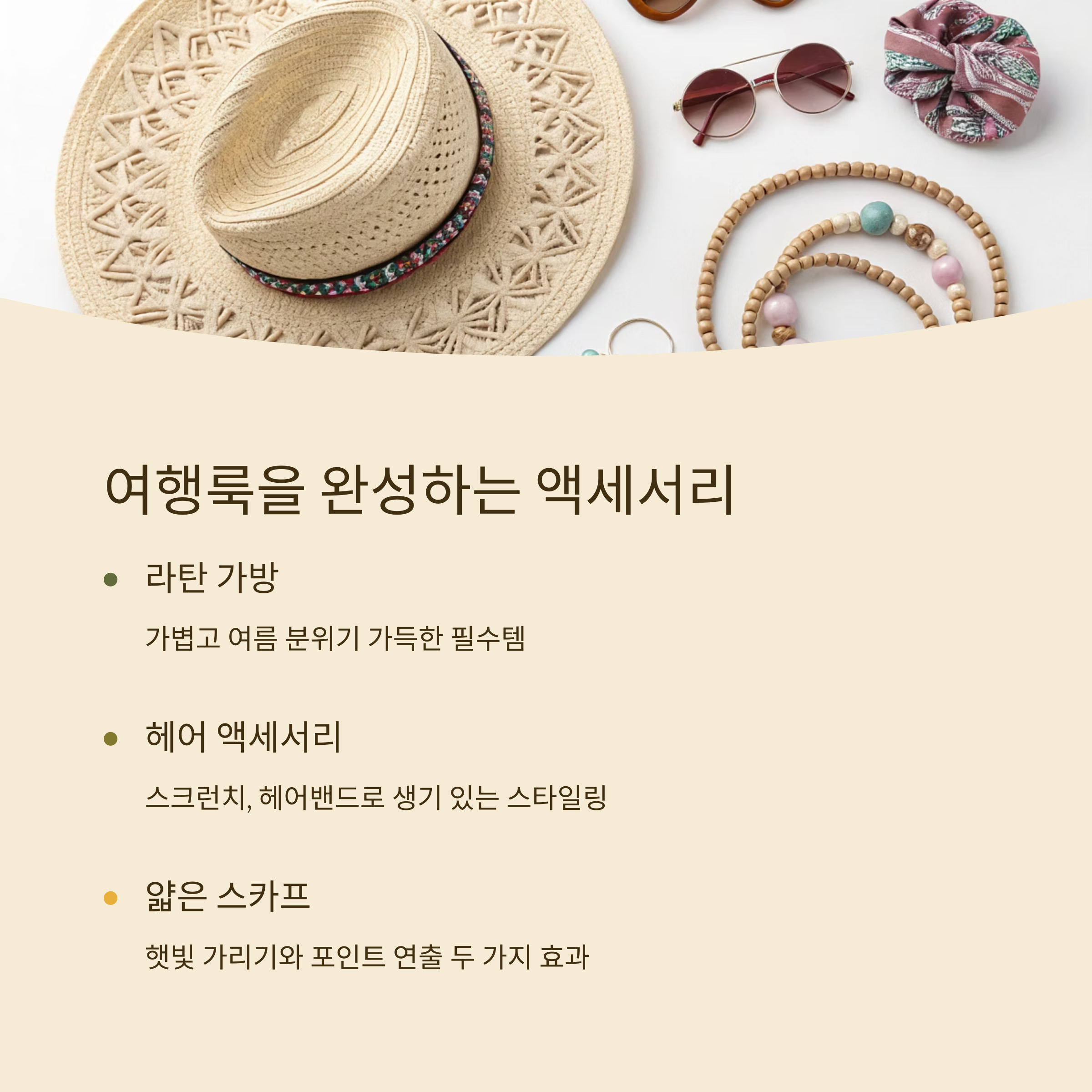 추천하는 아이템은 가볍고 통기성 좋은 라탄 소재의 가방, 선글라스, 미니 귀걸이, 스카프예요. 선글라스는 자외선 차단뿐 아니라 스타일링에도 좋고, 얇은 스카프는 햇볕 가리기용으로도 활용돼요.