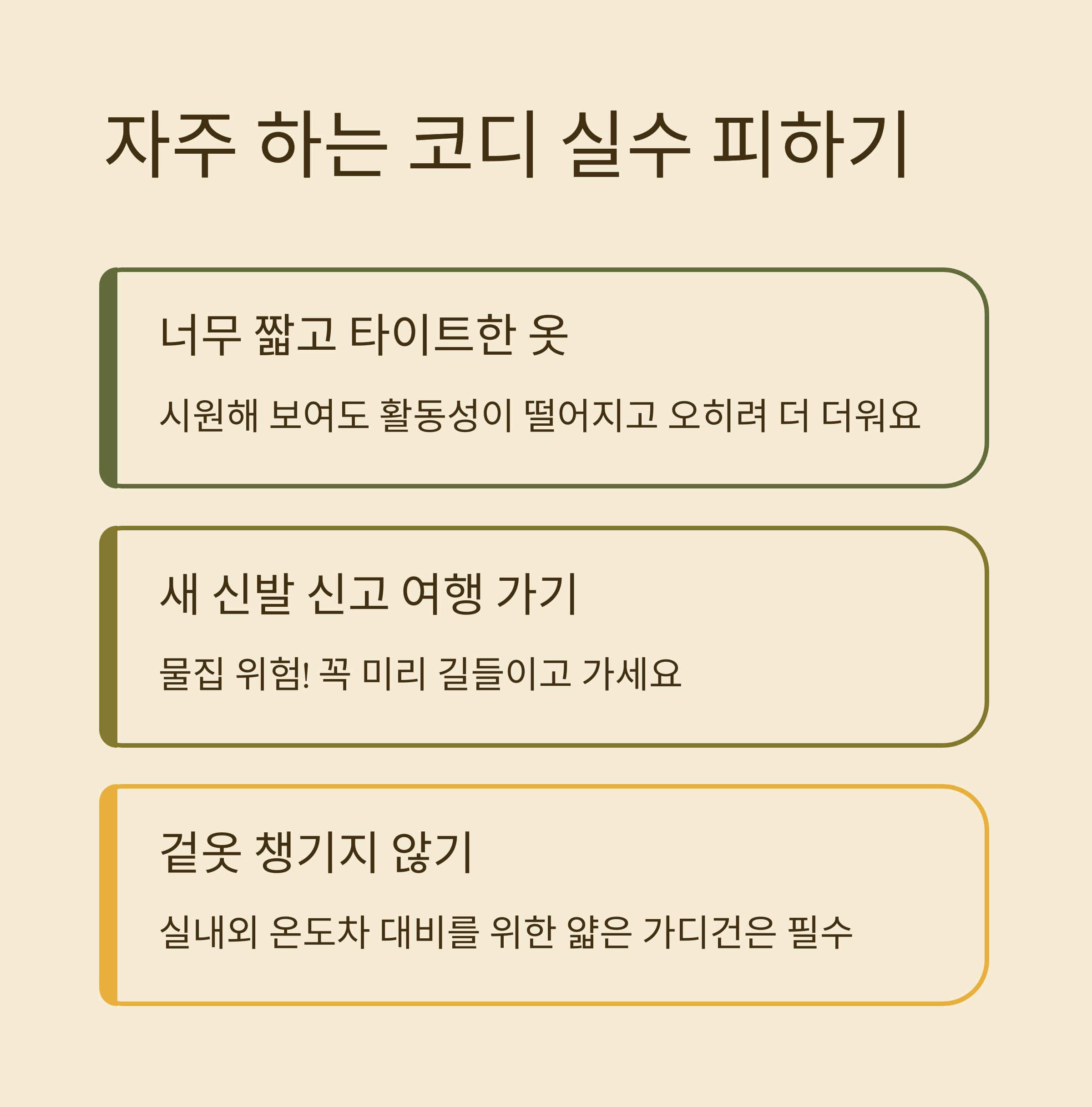 여름 여행에서 자주 하는 코디 실수 중 하나는 ‘너무 짧고 타이트한 옷’을 선택하는 거예요. 시원해 보일 수는 있지만 오히려 움직임이 불편하고 땀이 차면 더 더워요. 활동성 좋은 디자인을 선택하세요.