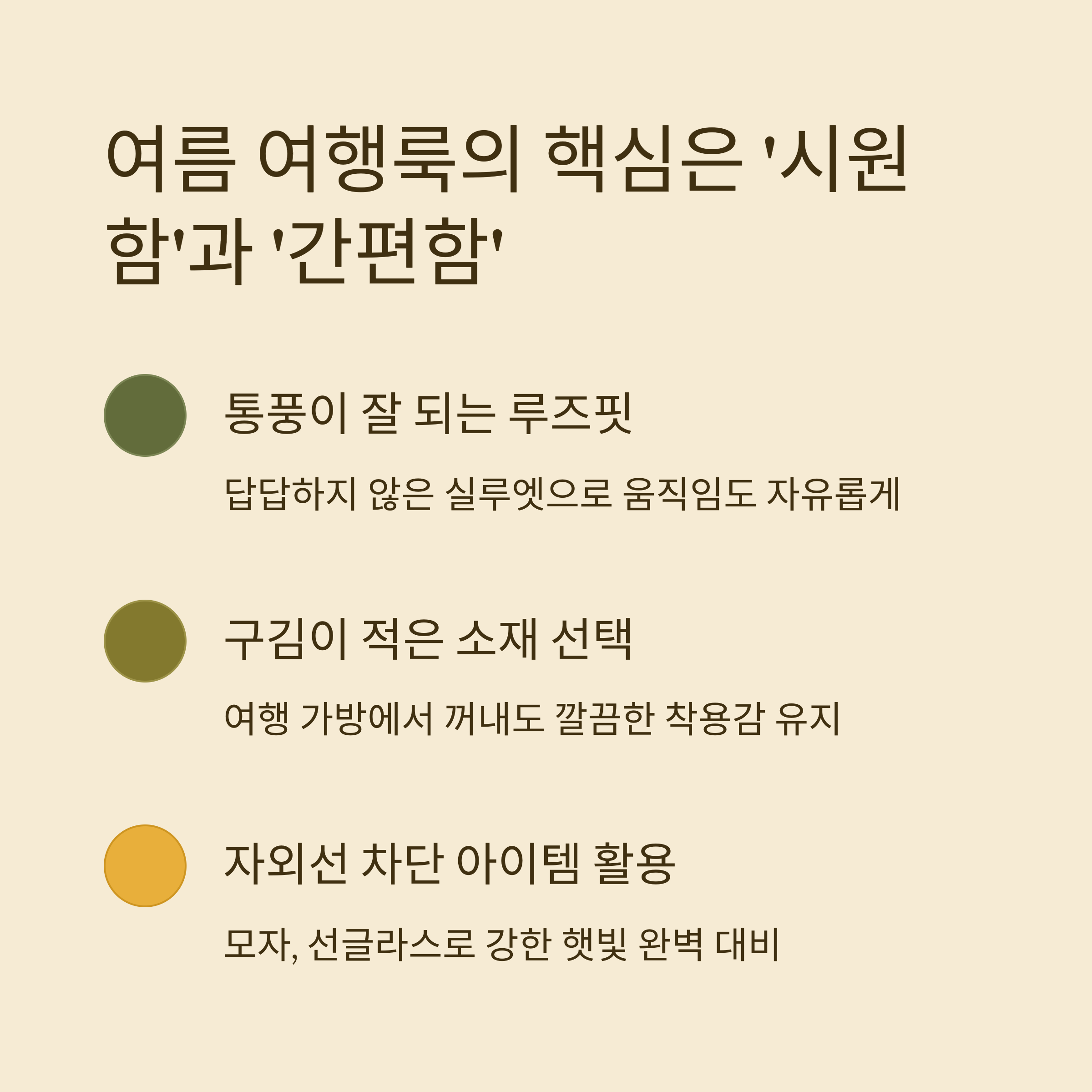 여름 여행룩의 핵심은 '시원함'과 '간편함'이에요. 더운 날씨 속에서도 땀에 젖지 않고 쾌적하게 입을 수 있어야 하죠. 통풍이 잘 되는 루즈핏이나 린넨, 얇은 면 소재는 여름철에 딱이에요. 거기에 활동성이 좋고 구김이 적은 아이템까지 챙기면 더욱 편리하죠.