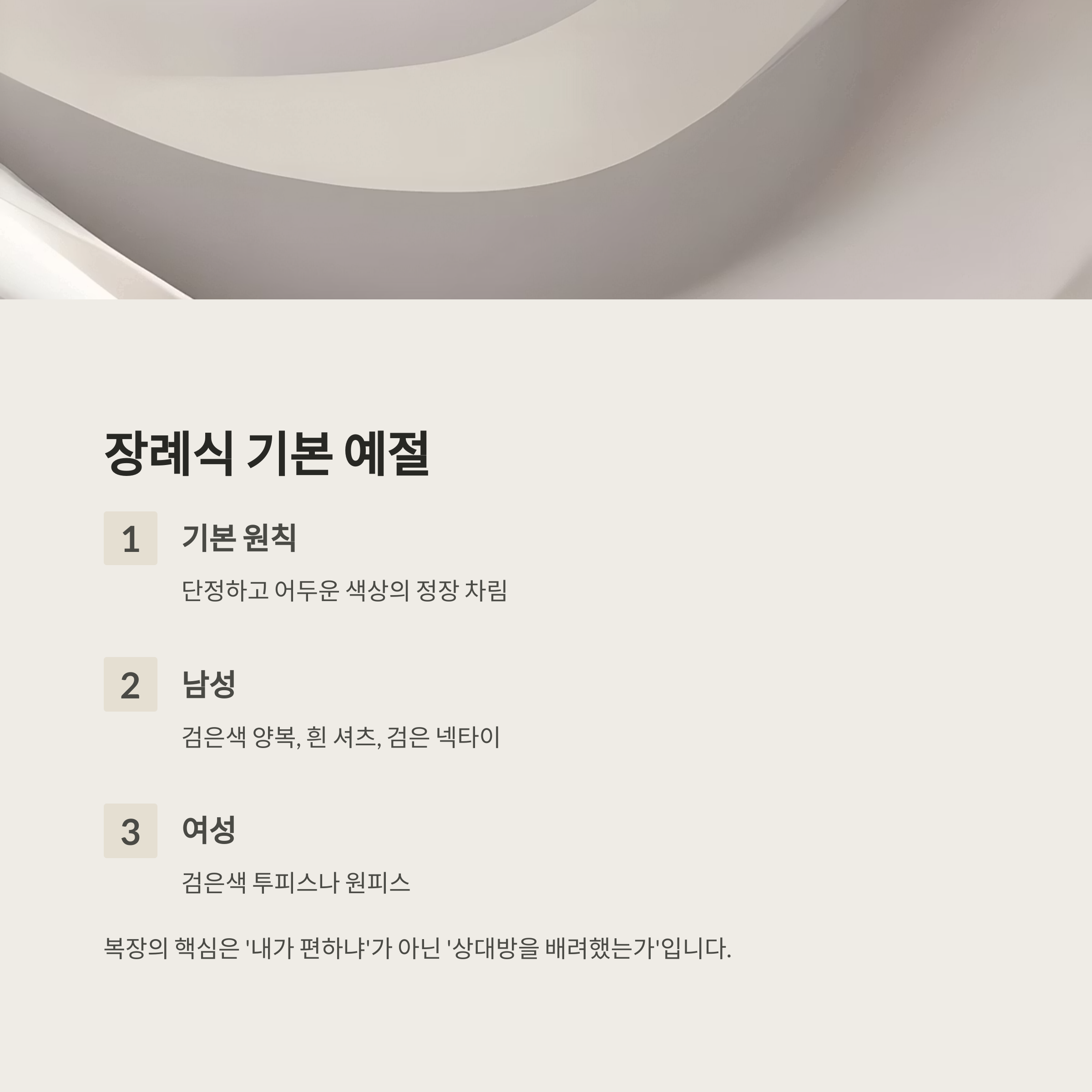 복장을 고를 때 가장 중요한 건 "내가 편하냐"가 아니라 "상대방이 불쾌하지 않도록 배려했는가"라는 점이에요. 그래서 장례식 복장은 계절과 상관없이 항상 ‘단정하고 정중한 분위기’를 유지해야 해요.
