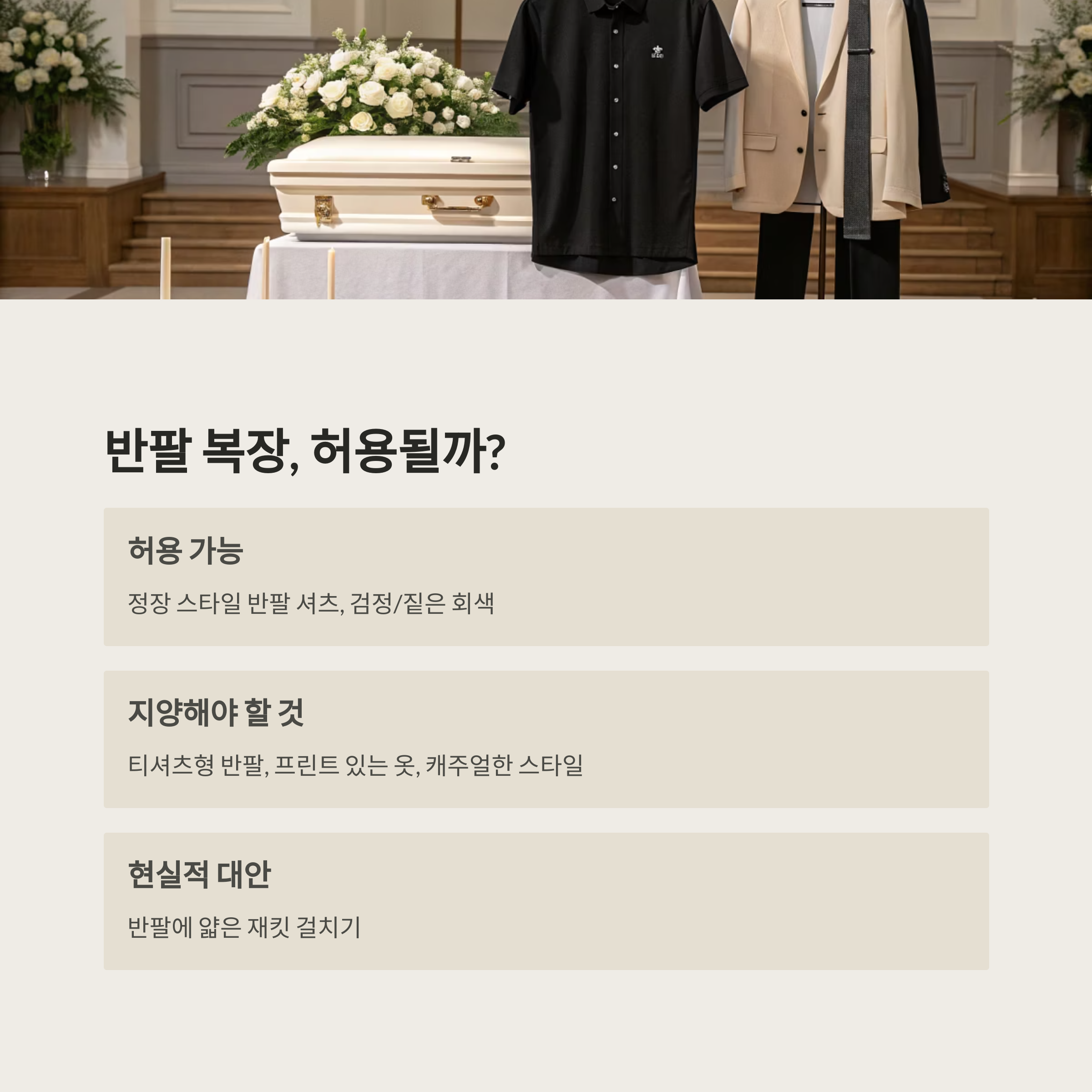 | 얇은 재킷+반팔 | 허용 | 실내 장례식 추천 |
