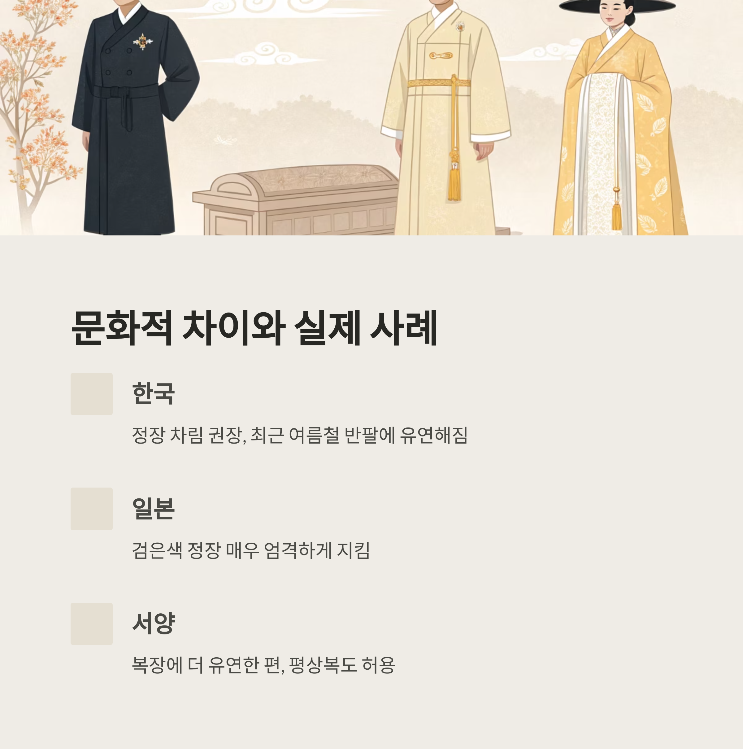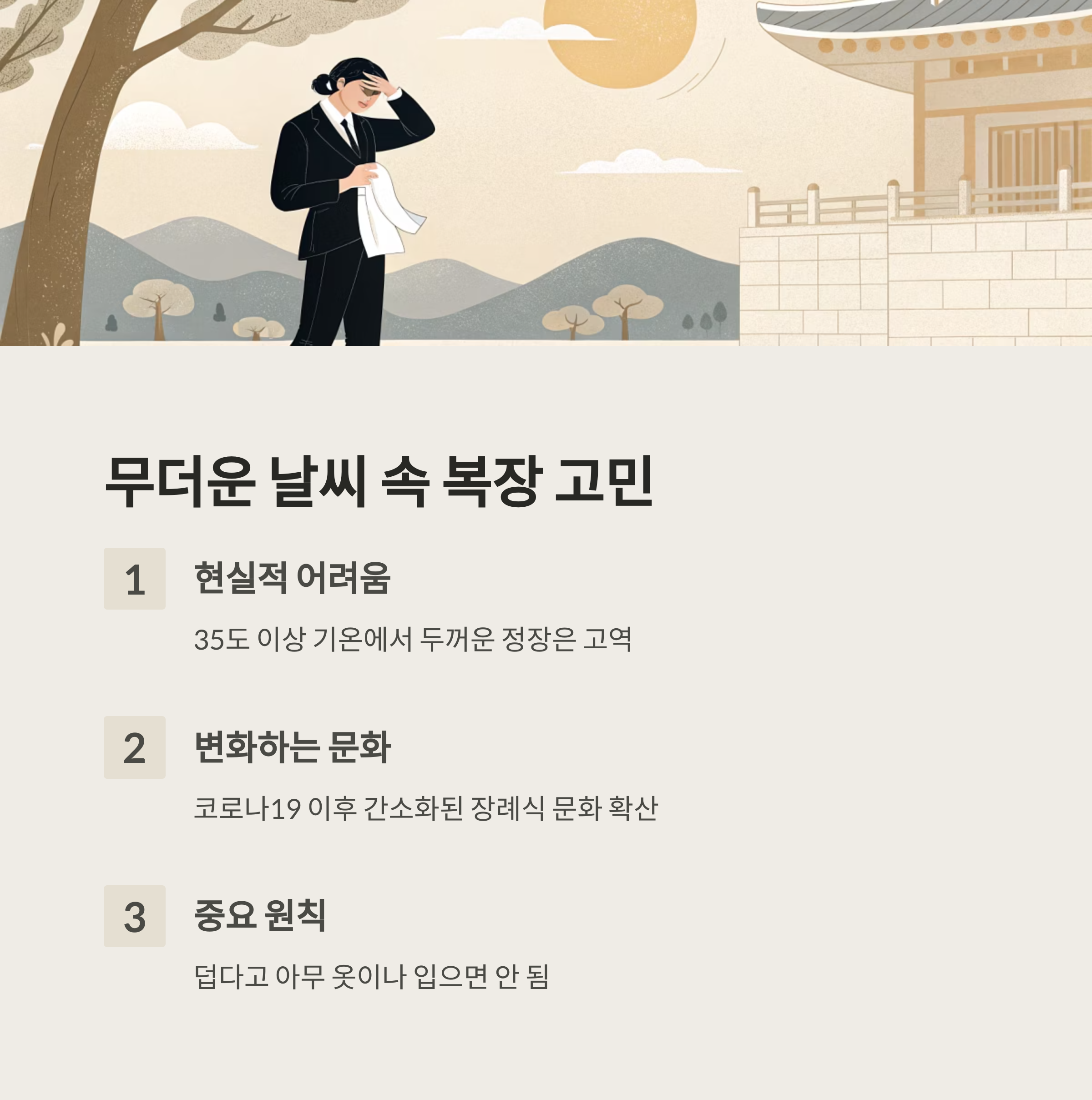 물론 여전히 일부 어르신들 사이에서는 "장례식은 무조건 긴팔"이라는 인식이 있기 때문에, 가능하면 조문 전에 가족이나 지인에게 복장에 대해 간단히 물어보는 것도 지혜로운 방법이에요.