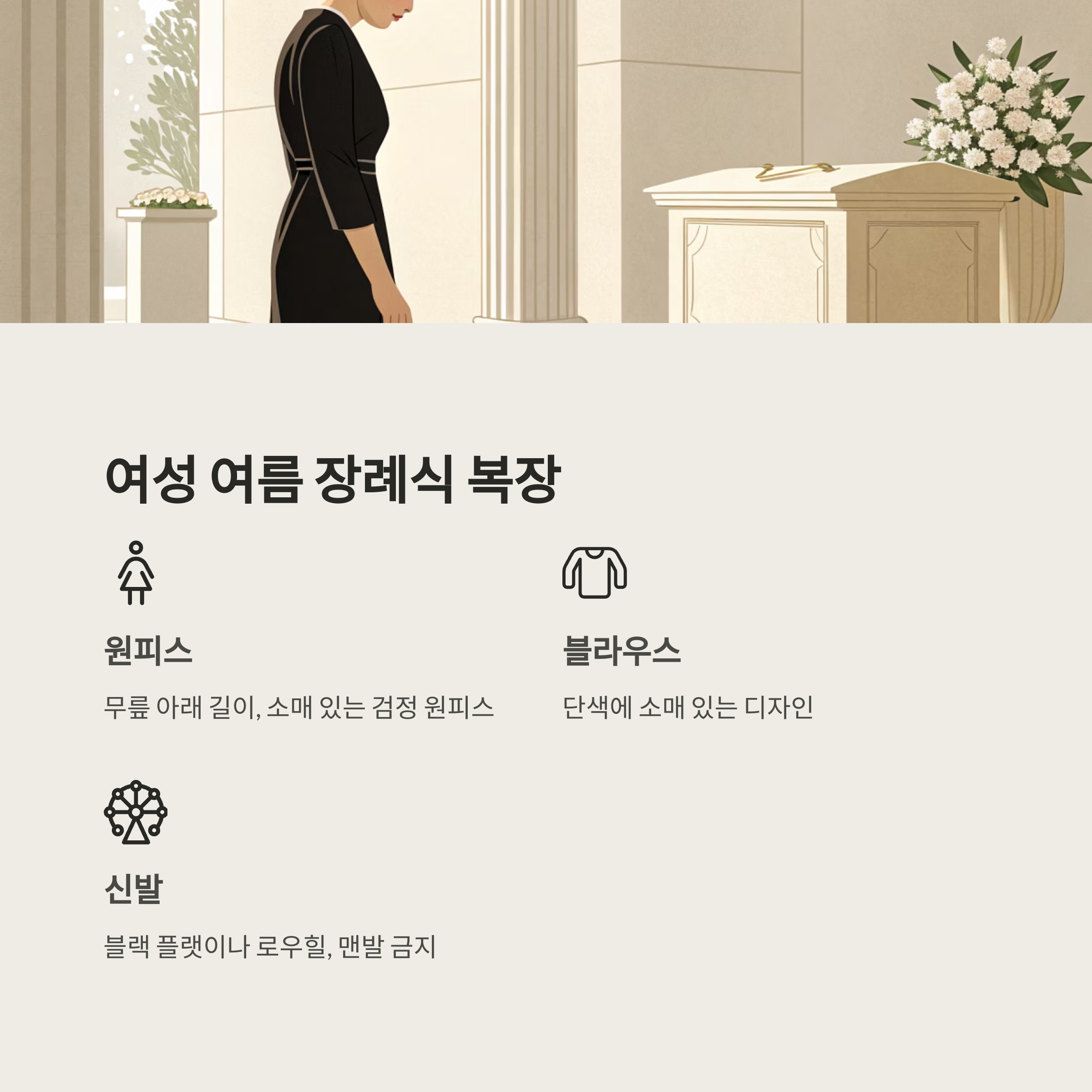 여성의 여름 장례식 복장은 남성보다 선택지가 조금 더 다양하지만, 그만큼 주의할 점도 많아요. 기본적으로 검정 원피스, 블라우스와 치마 또는 슬랙스를 조합한 복장이 가장 예의에 맞고, 무엇보다 단정함이 중요한 기준이에요.