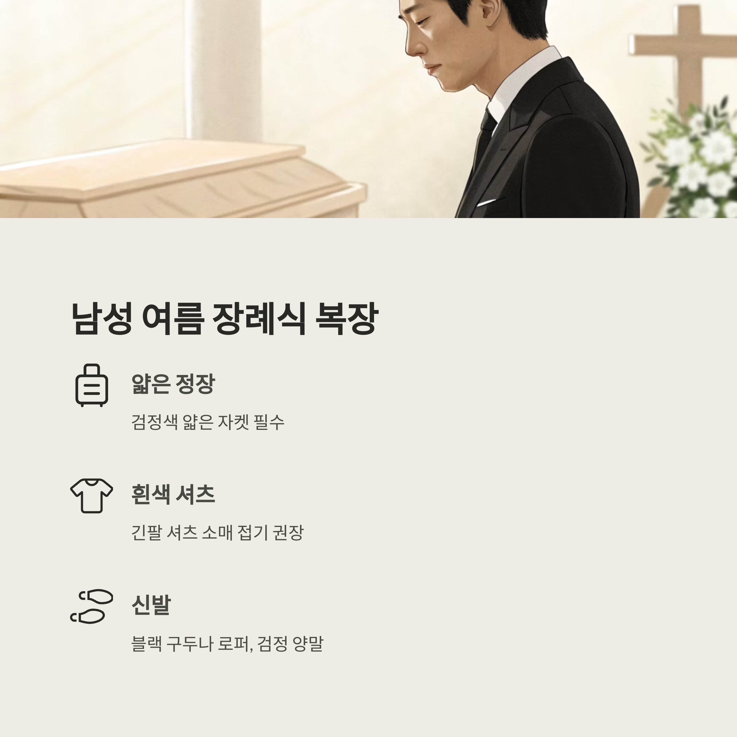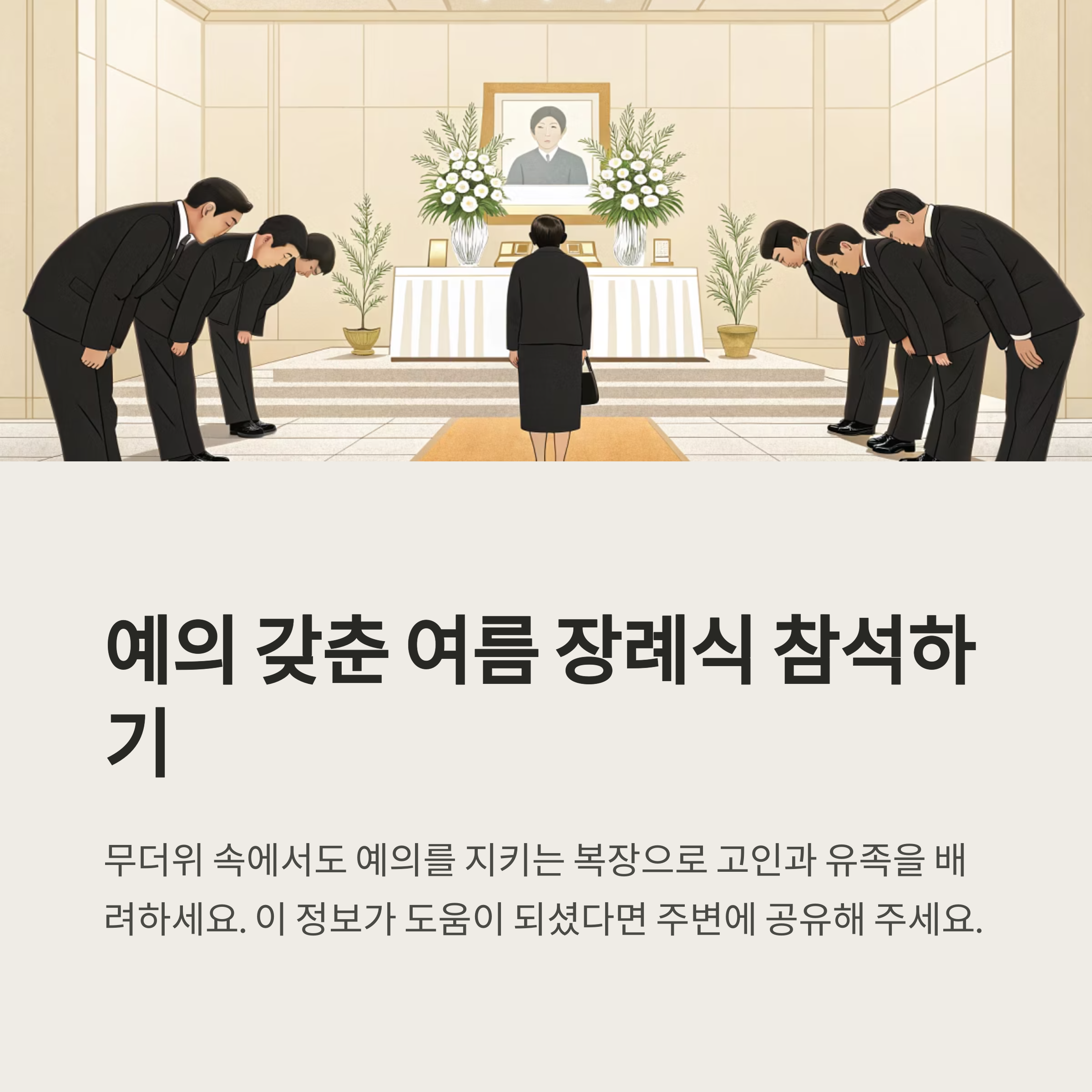 여름 장례식 복장은 단지 ‘더위에 맞춘 옷차림’이 아니라, 상대방을 배려하고 내 몸의 편안함도 챙기는 일종의 ‘균형 예절’이라고 생각해요.