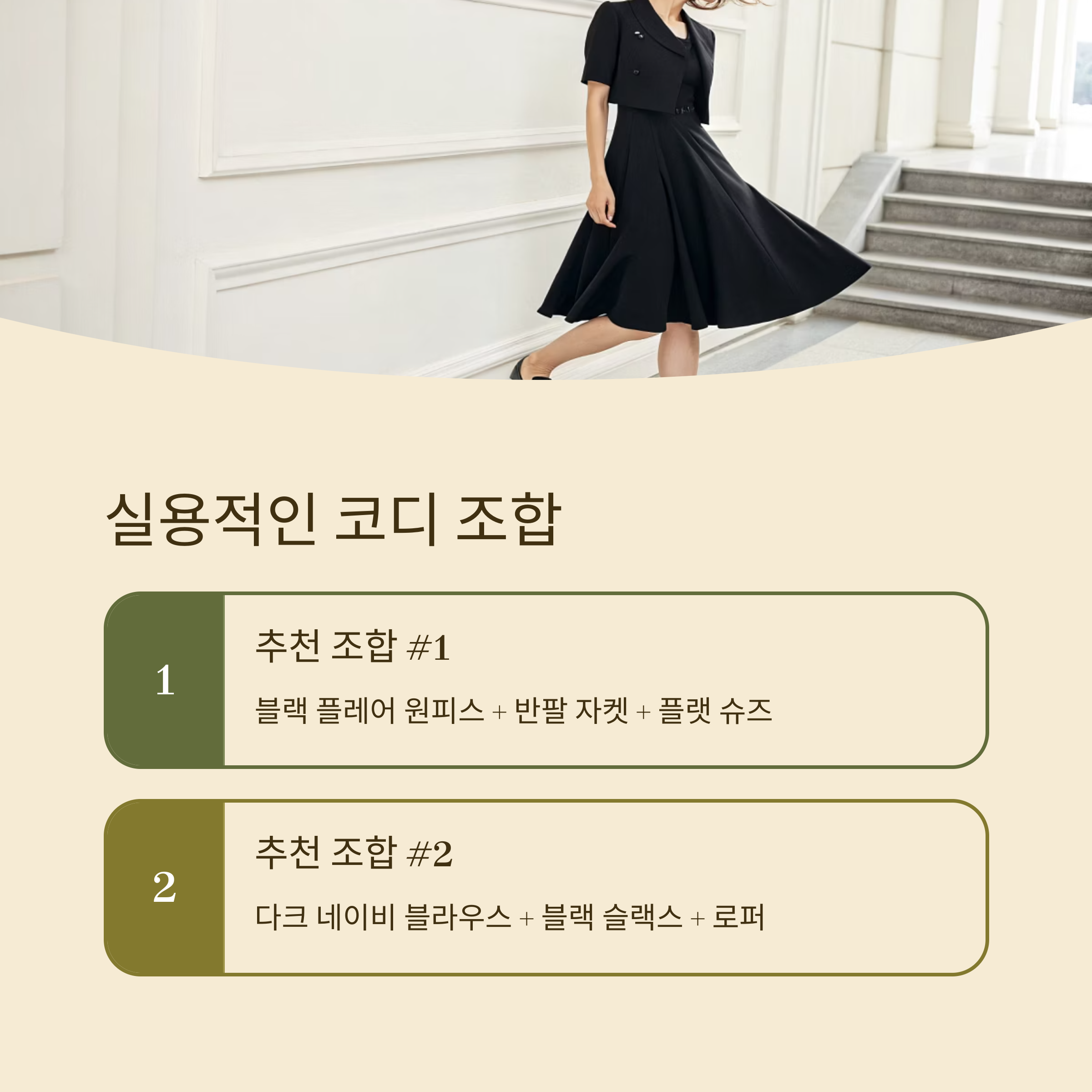 여름 장례식 복장에서는 코디 조합이 단조로워 보이지 않으면서도 격식을 지키는 것이 핵심이에요. 단색 블라우스와 블랙 팬츠 조합은 기본 중의 기본이고, 여기에 얇은 소재의 블랙 롱 베스트를 더하면 한층 포멀한 느낌을 줄 수 있어요.