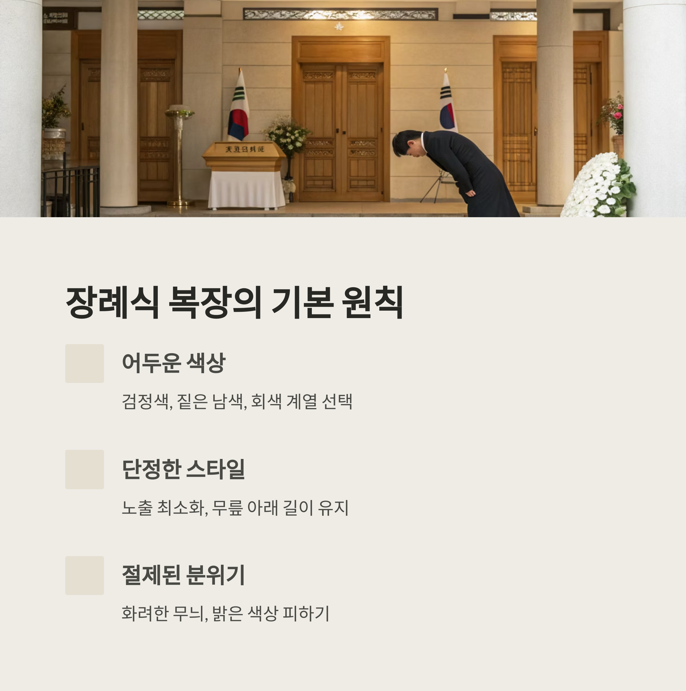 여름이라도 슬리퍼, 샌들, 민소매, 반바지, 밝은 무늬가 있는 옷은 삼가야 해요. 장례식장은 엄숙한 장소이므로 실내외 모두에서 조용하고 차분한 자세를 유지해야 해요.