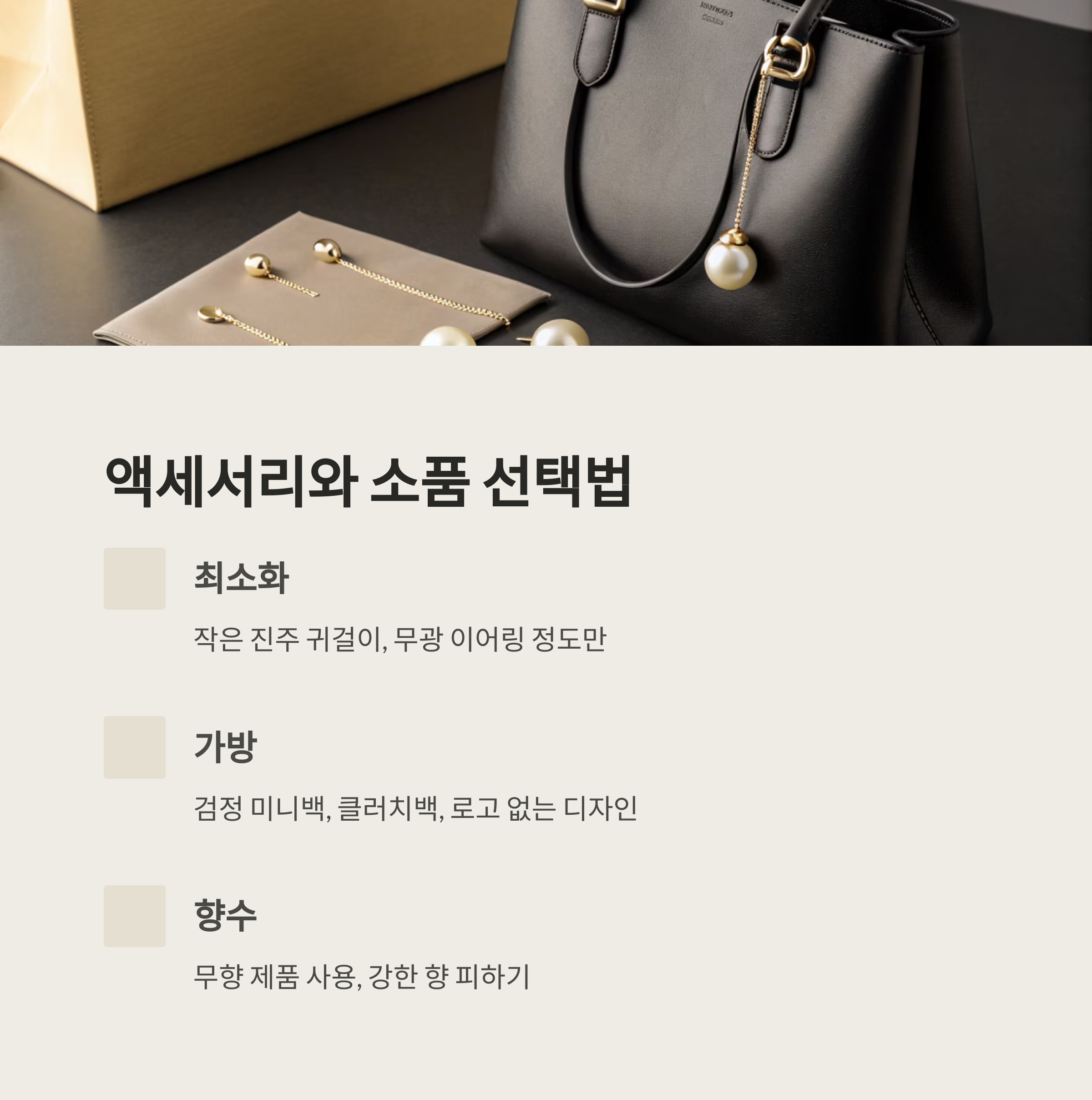 | 가방 | 검정 미니백, 클러치백 | 컬러 가방, 브랜드 로고 |