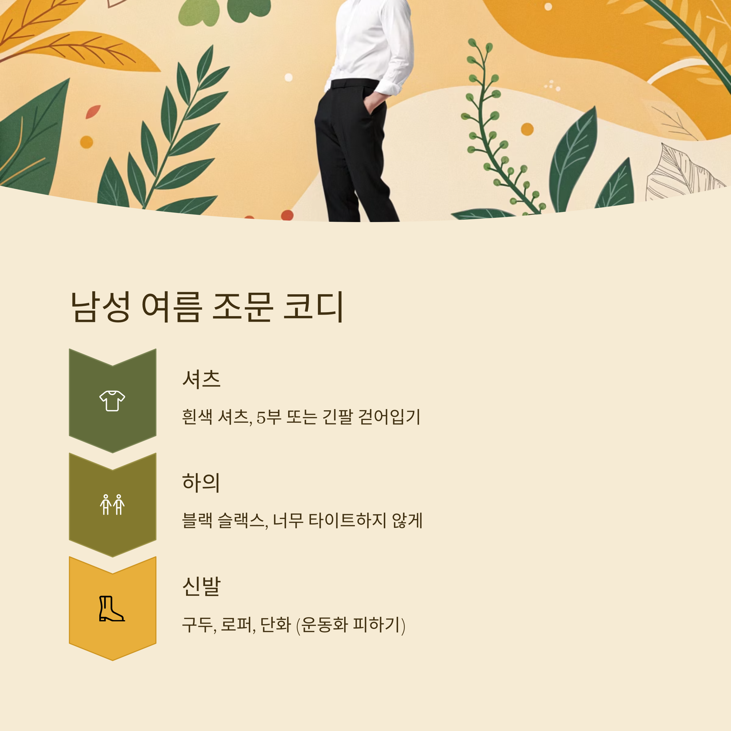 남성의 경우 여름철이라 해도 단정한 셔츠는 필수에요. 흰색 셔츠에 블랙 슬랙스 조합은 기본 중의 기본이에요. 너무 짧은 반팔 셔츠보다는 5부 혹은 긴팔을 걷어 입는 스타일이 더 좋아요.