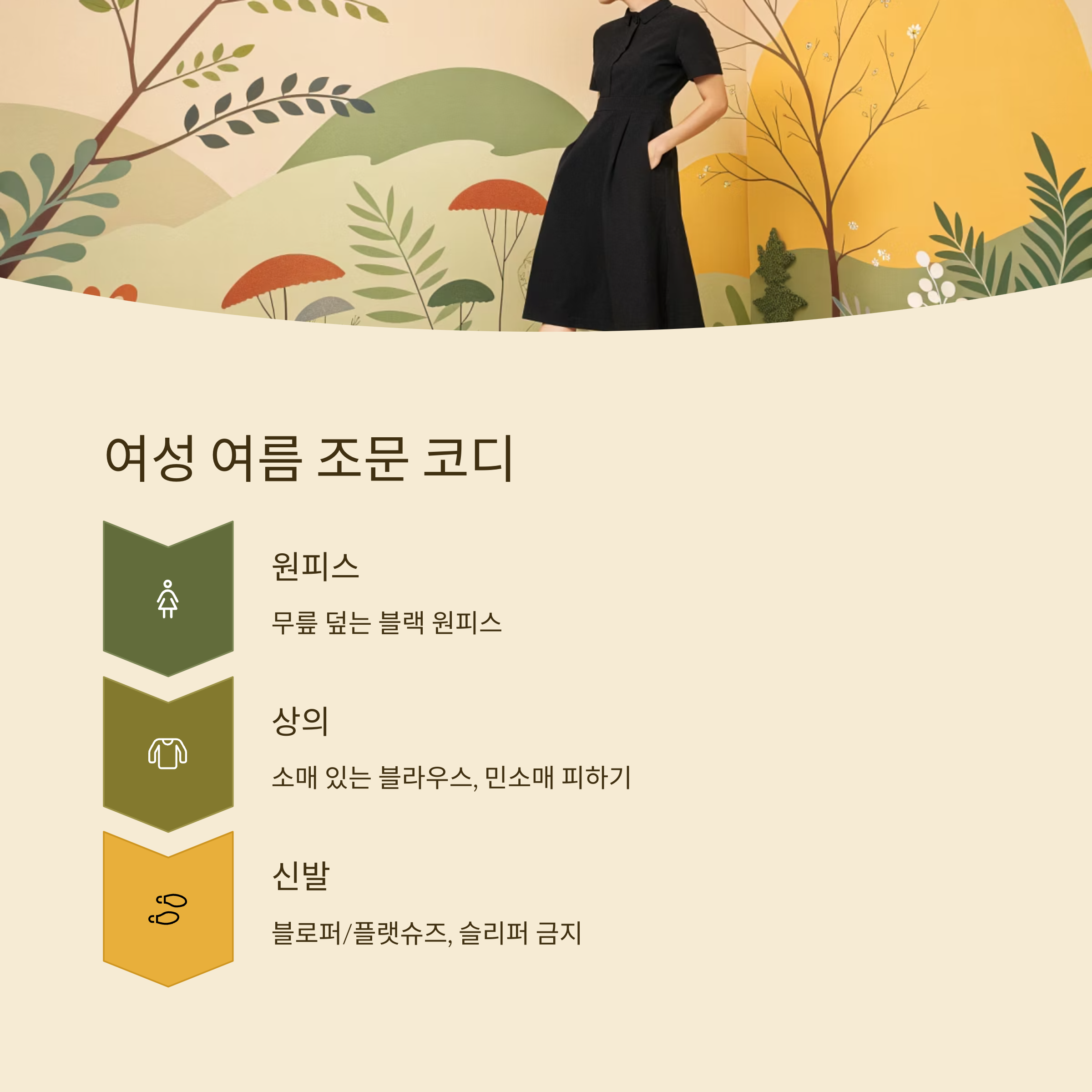여름철 여성 조문복의 핵심은 ‘단정함과 통풍’이에요. 무릎을 덮는 블랙 원피스는 실패 없는 선택이에요. 소매가 짧더라도 너무 타이트하지 않으면 예의상 무리 없어요.