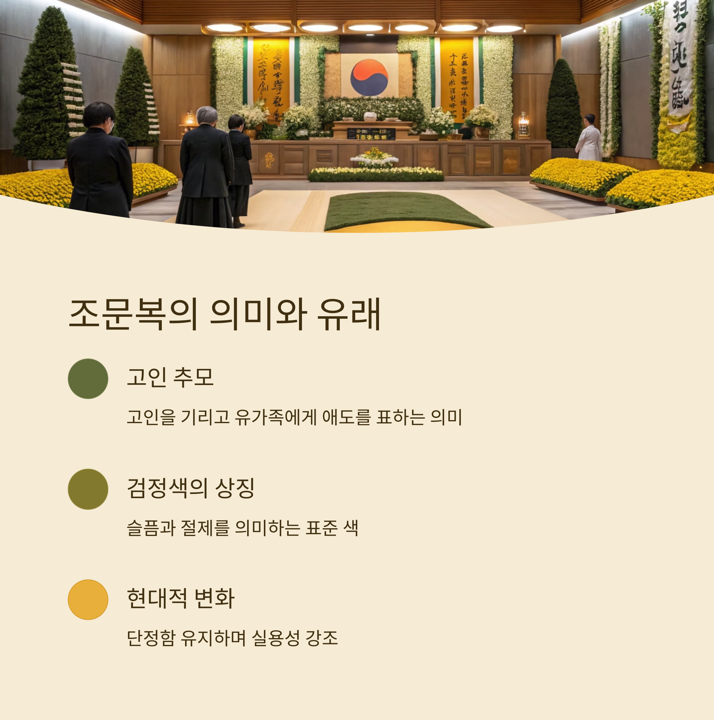 조문복은 고인을 기리고, 유가족에게 애도를 표하기 위해 입는 복장이에요. 유래는 고대 중국과 조선시대의 상복 문화에서 시작되었고, '검정색'은 슬픔과 절제를 의미하며 점차 장례 문화의 표준 색으로 자리잡았답니다.