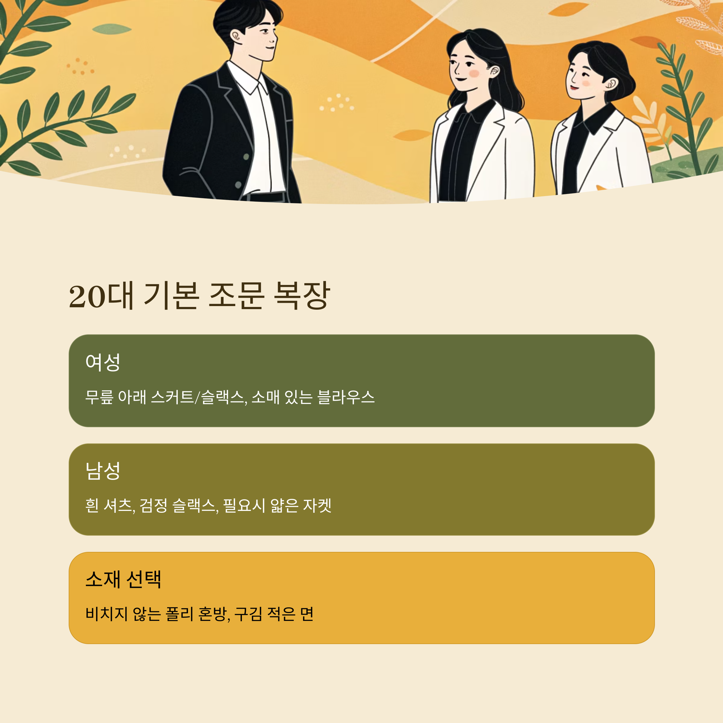 20대라면 격식은 지키되 너무 과하지 않은 ‘깔끔함’을 유지하는 게 좋아요. 여성이라면 무릎 아래 길이의 스커트나 슬랙스가 적당하고, 남성은 블레이저 없이 셔츠만 입어도 무방한 경우도 있어요.