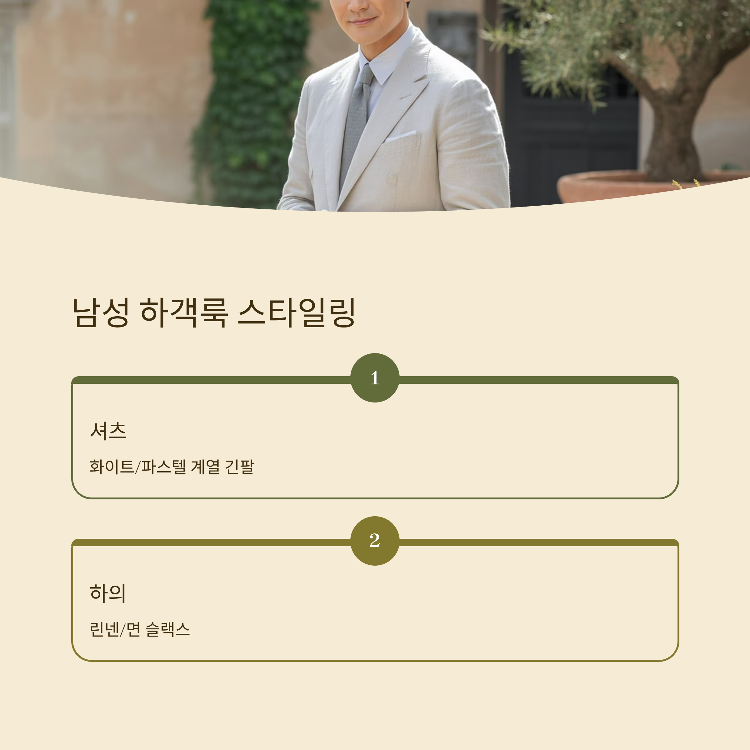 남성 하객룩은 깔끔함이 가장 중요해요. 여름엔 땀이 많이 나기 때문에 짙은 컬러보다 연한 색의 셔츠나 재킷이 훨씬 시원한 인상을 줘요. 화이트 셔츠는 언제나 기본이고, 민트나 연하늘색 셔츠도 계절감 있게 잘 어울려요. 셔츠는 얇고 뻣뻣하지 않은 소재로 선택하고, 너무 타이트하지 않게 입는 것이 좋아요.