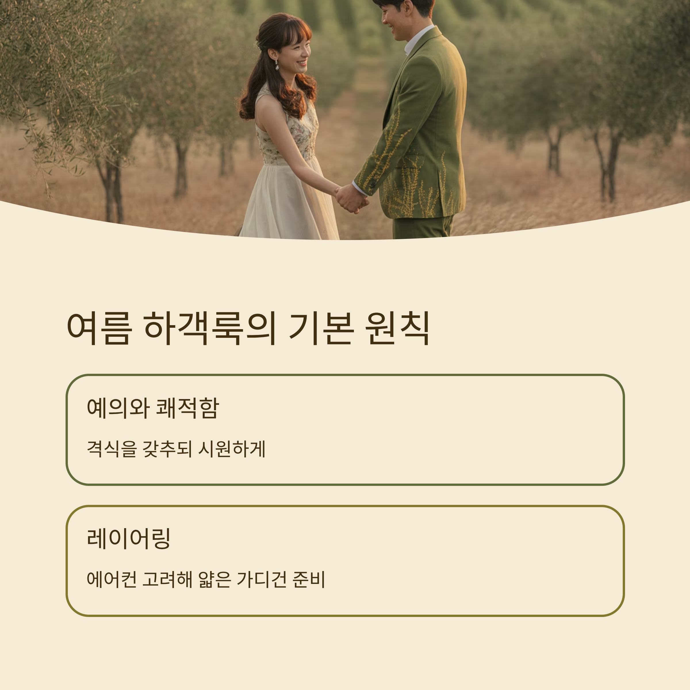 여성 하객은 원피스나 블라우스+스커트 조합이 많이 선택되고, 남성 하객은 밝은 색 셔츠에 슬랙스, 여름용 재킷을 매치하는 경우가 많아요. 중요한 건 너무 화려하거나 신부·신랑보다 튀는 옷은 피하고, 단정하면서도 계절감 있게 연출하는 것이에요.