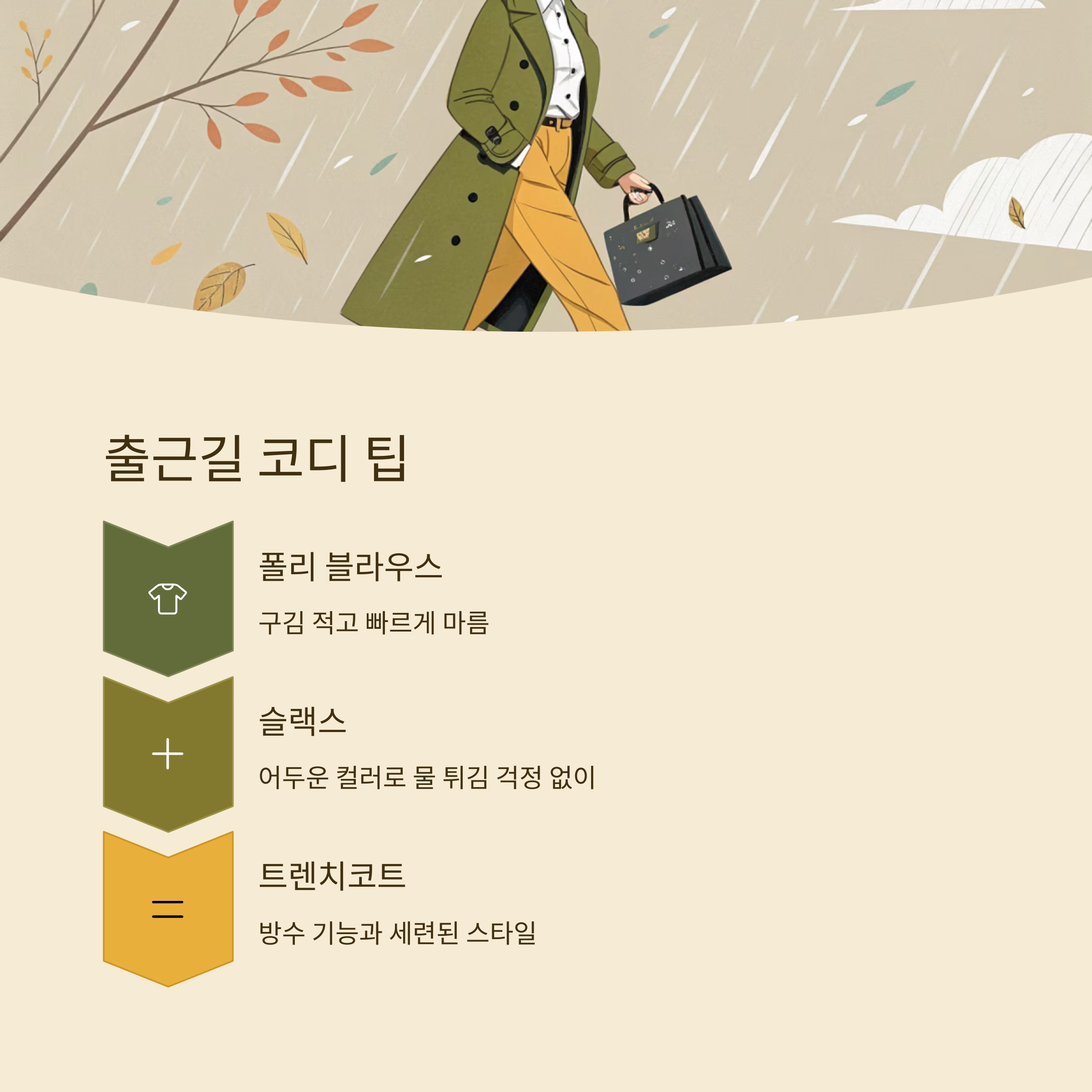 | 출근길 | 폴리 블라우스 + 슬랙스 + 트렌치코트 | 방수 토트백 + 네이비 레인부츠 |