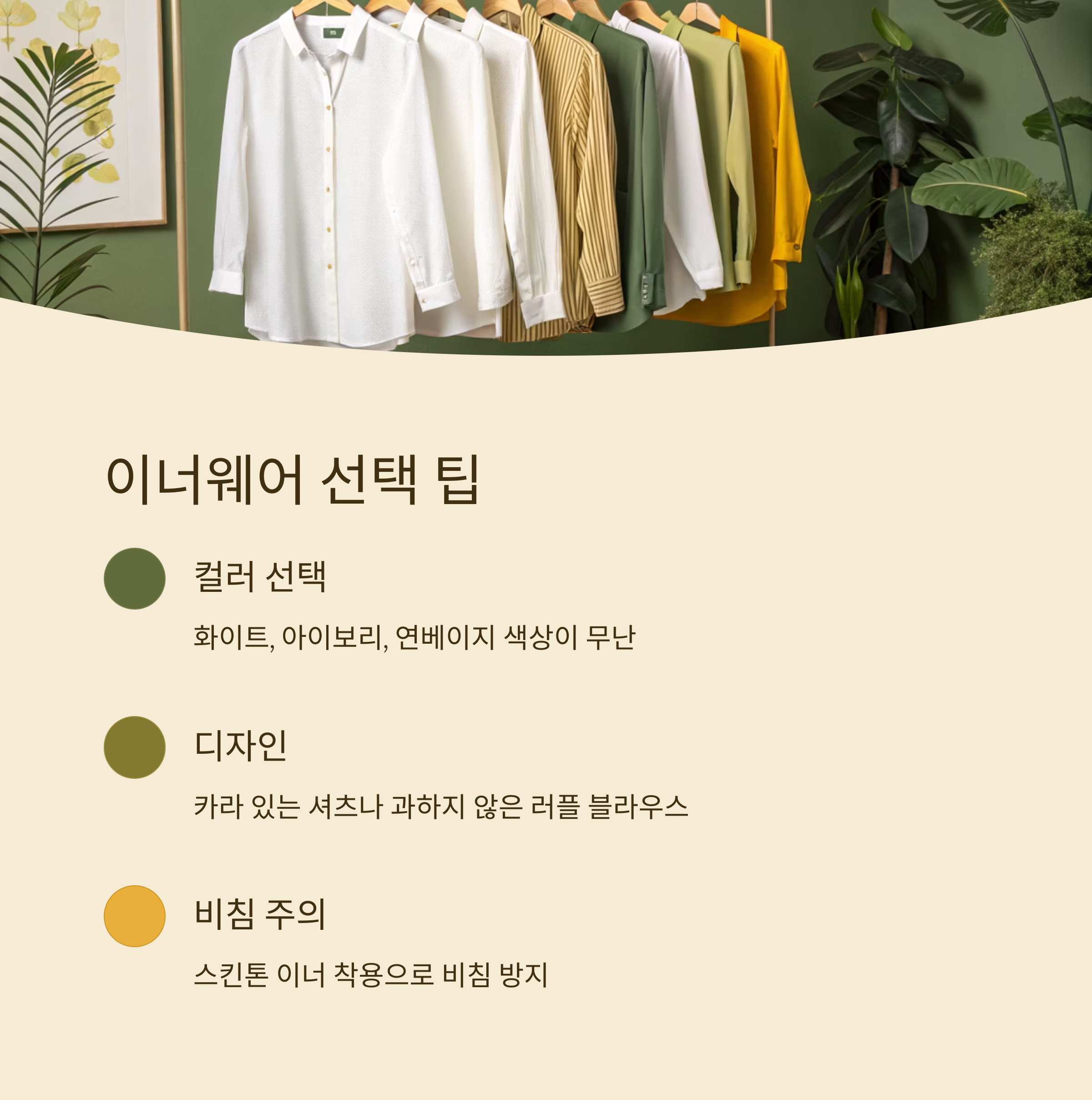 이너웨어는 생각보다 중요해요. 아무리 멋진 정장을 입어도 안에 입은 블라우스나 셔츠가 구겨져 있거나 어울리지 않으면 전체 인상이 흐트러질 수 있어요. 밝은 톤의 셔츠나 블라우스가 기본이고, 특히 화이트, 아이보리, 연베이지 색상이 무난하고 단정해 보여요.