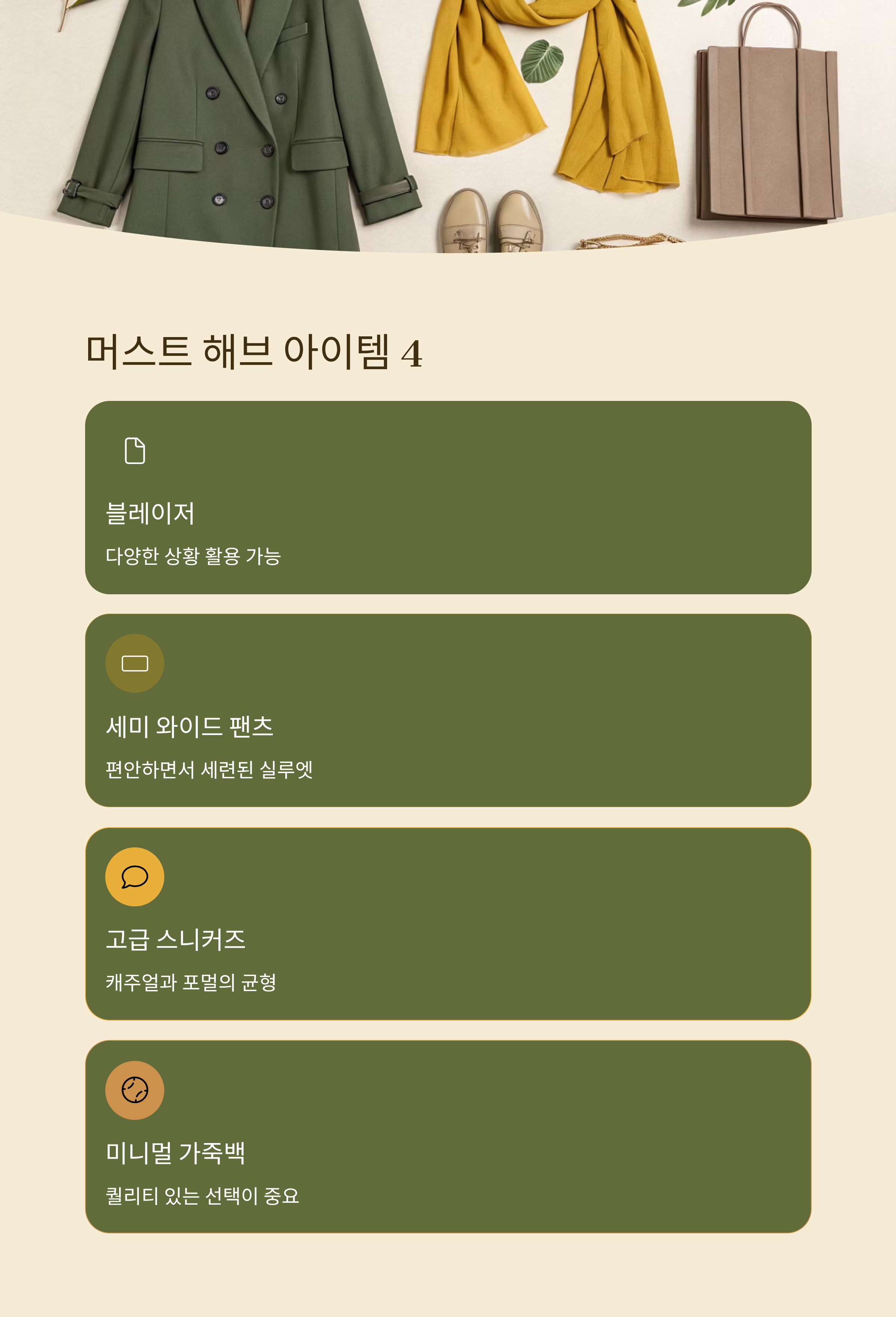 2025년 영포티 룩을 완성하기 위한 머스트 해브 아이템으로는 블레이저, 세미 와이드 팬츠, 고급스러운 스니커즈, 미니멀 가죽 가방이 있어요. 이런 기본 아이템은 다양한 상황에 맞춰 활용할 수 있어서 실용적이에요.