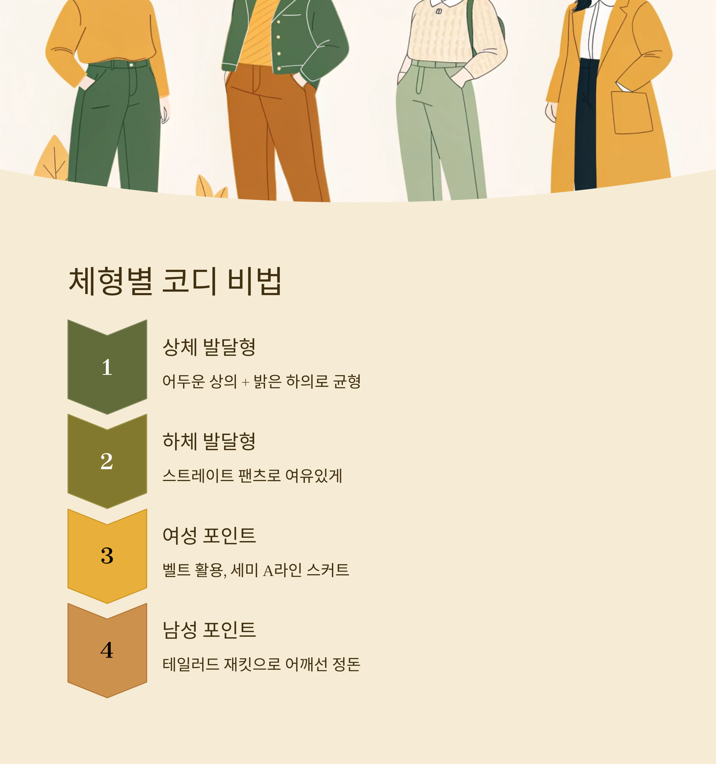 체형을 고려한 코디는 영포티 룩에서 가장 중요한 포인트 중 하나예요. 상체가 발달한 경우에는 어두운 톤의 상의를 입고 하의는 밝게 매치하면 균형이 맞아요. 반대로 하체가 발달했다면 슬림핏 팬츠 대신 여유 있는 스트레이트 팬츠가 잘 어울려요.