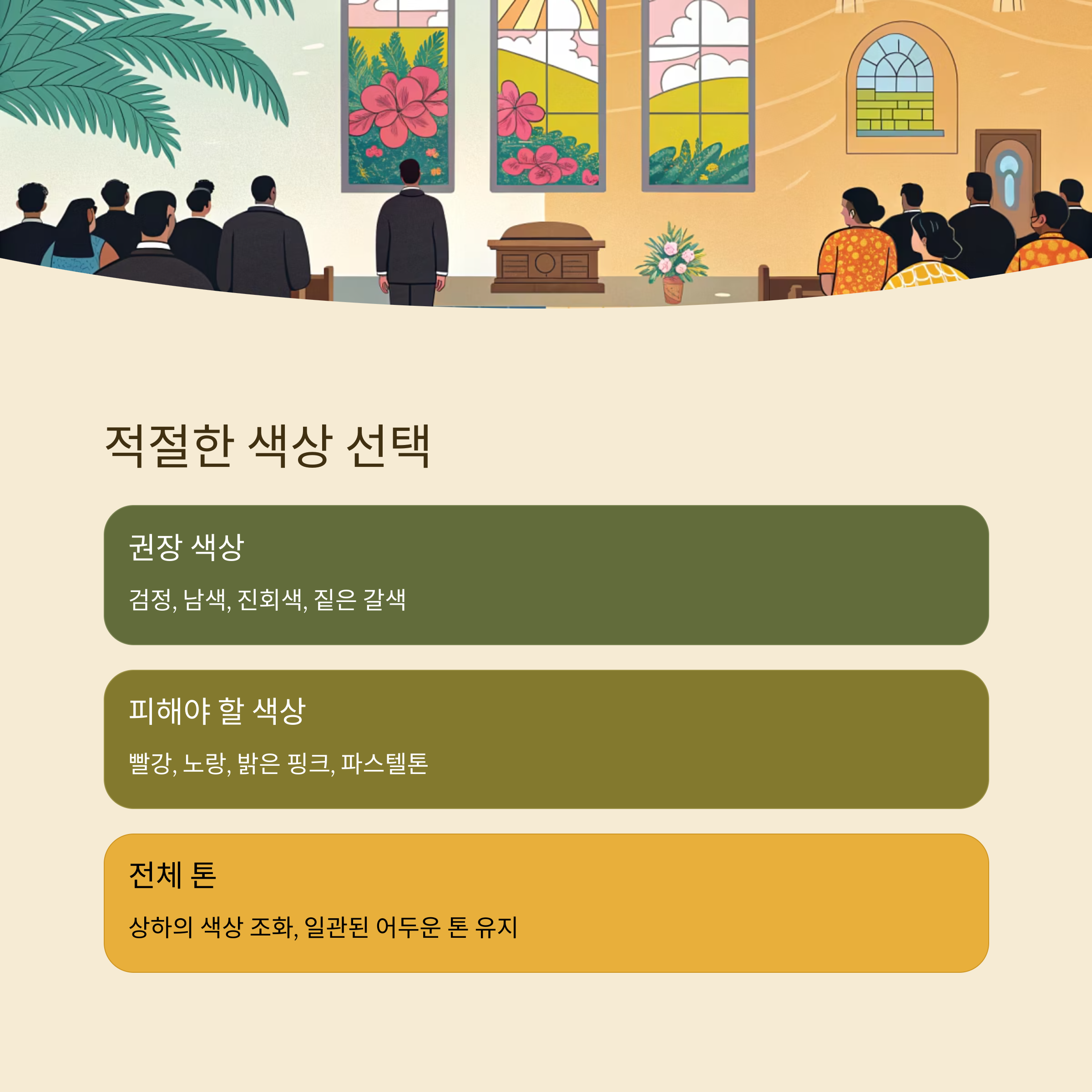 반대로 피해야 할 색상은 분명해요. 빨강, 노랑, 밝은 핑크 등 강렬한 원색이나 파스텔톤은 절대 피해야 해요. 이는 너무 눈에 띄고 유쾌한 분위기를 전달할 수 있어, 경건한 자리에 맞지 않기 때문이에요. 흰색 셔츠는 괜찮지만, 너무 밝은 아이보리 톤은 되도록 피하는 게 좋답니다.