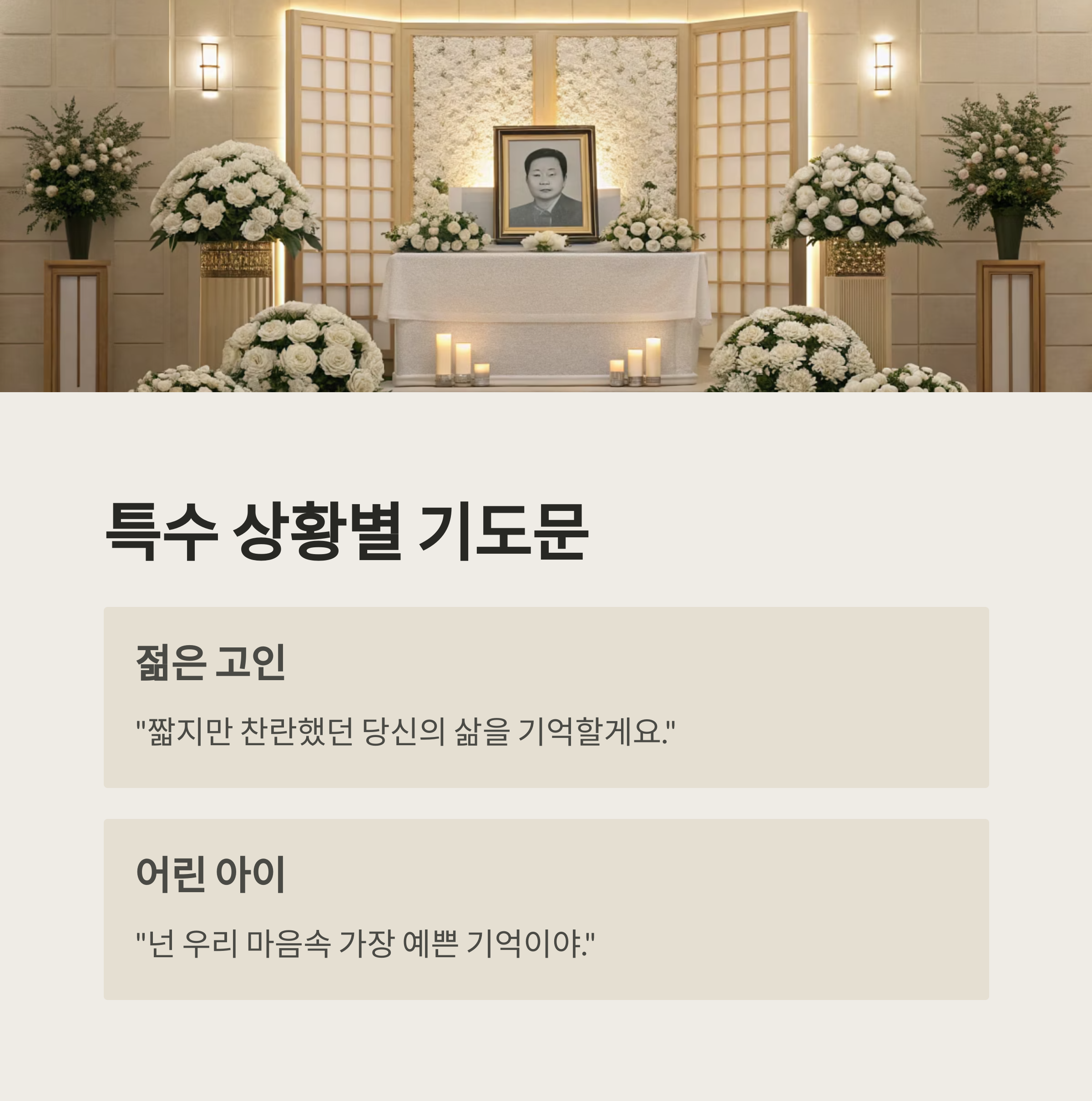 | 젊은 고인 | 빛, 그리움, 여운 | "짧지만 찬란했던 당신의 삶을 기억할게요." |