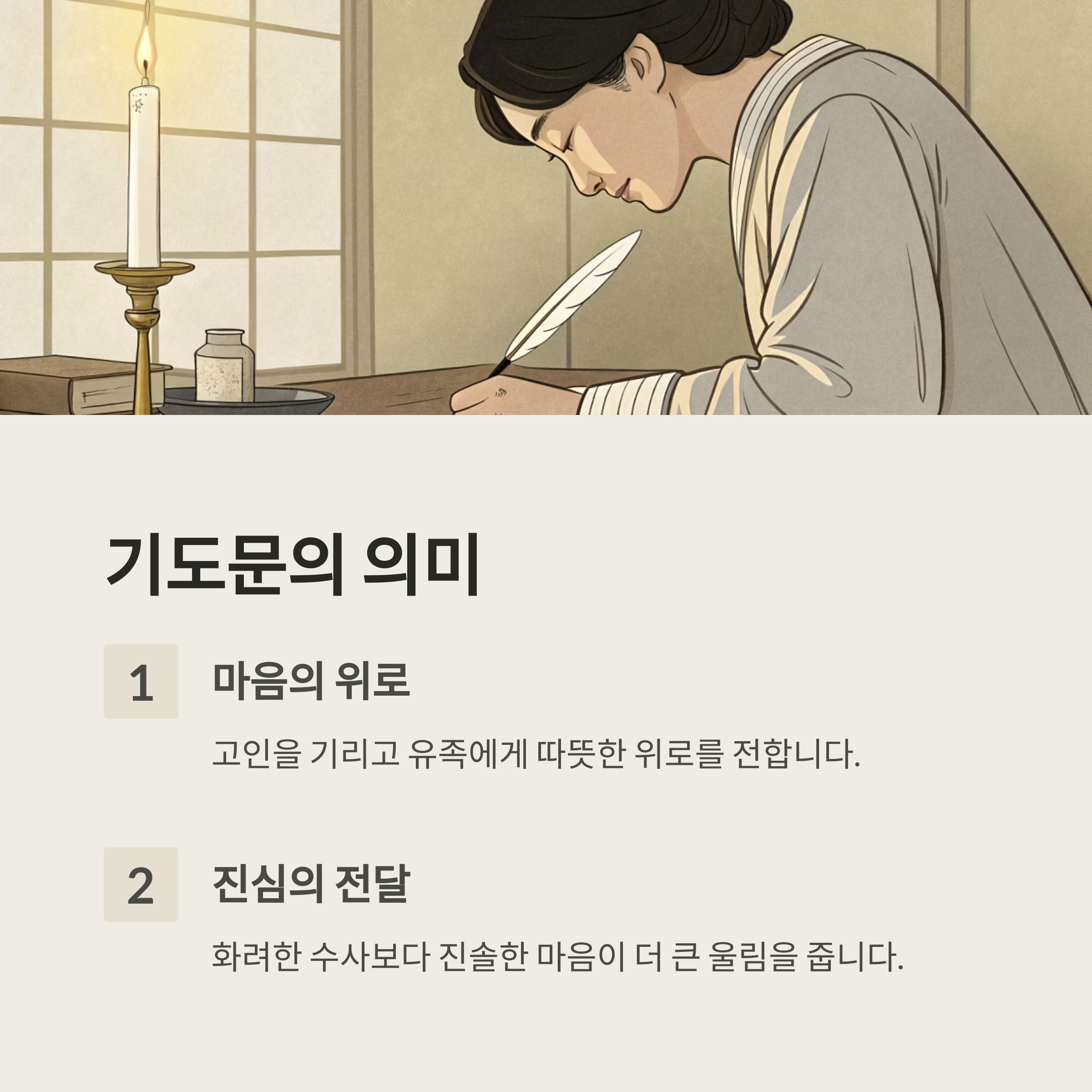 내가 생각했을 때, 가장 울림 있는 기도문은 화려한 수사가 아니라 고인을 사랑했던 마음이 진솔하게 담겨 있는 글이에요. 특히 장례식장이라는 무거운 분위기 속에서는 그 진심이 더 크게 와닿죠.