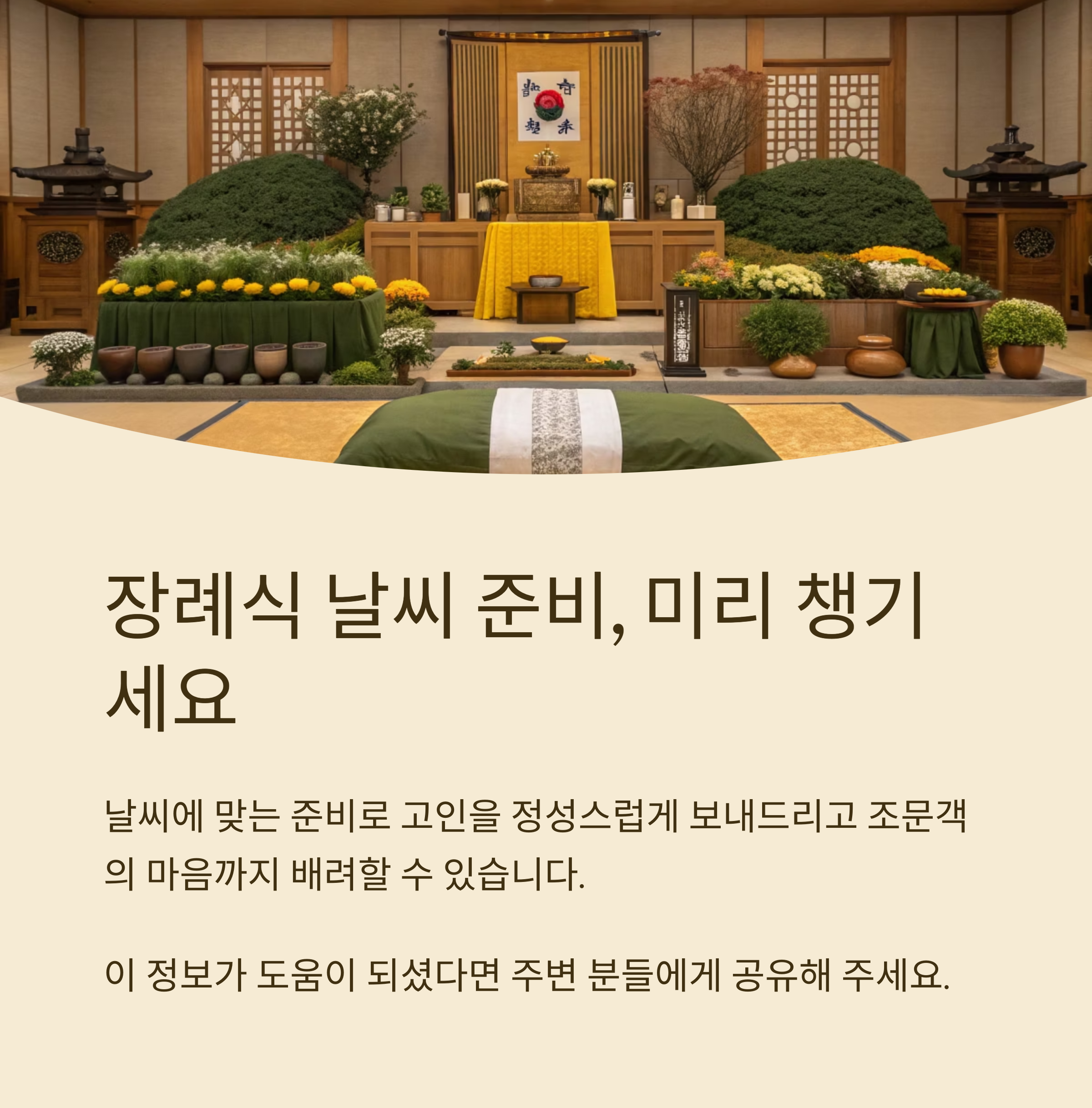 예상하지 못한 날씨에도 당황하지 않고 차분하게 대처할 수 있다면, 유족과 조문객 모두에게 편안하고 정성스러운 기억으로 남게 될 거예요. 🌈