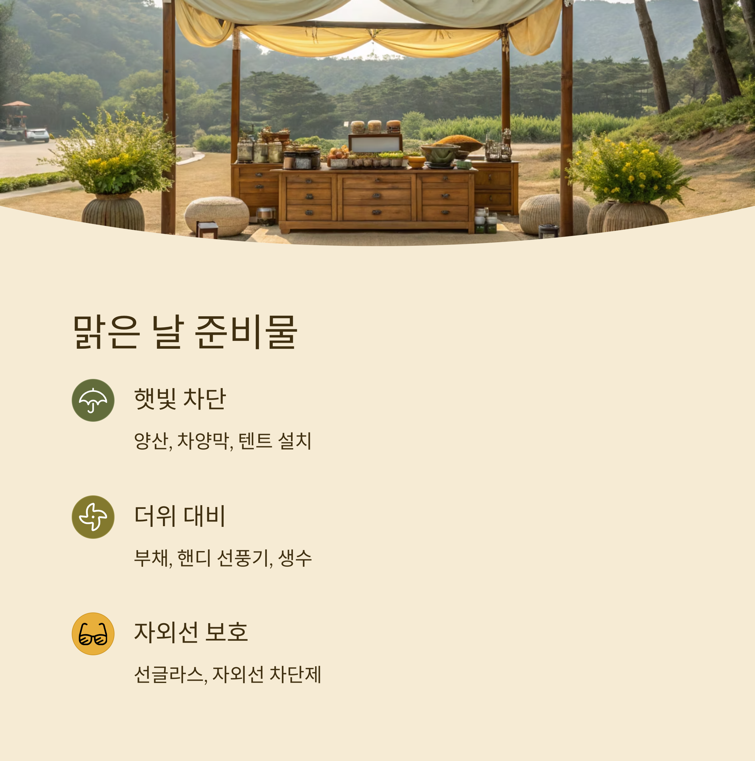| 양산/차양막 | 강한 햇빛 차단용 |