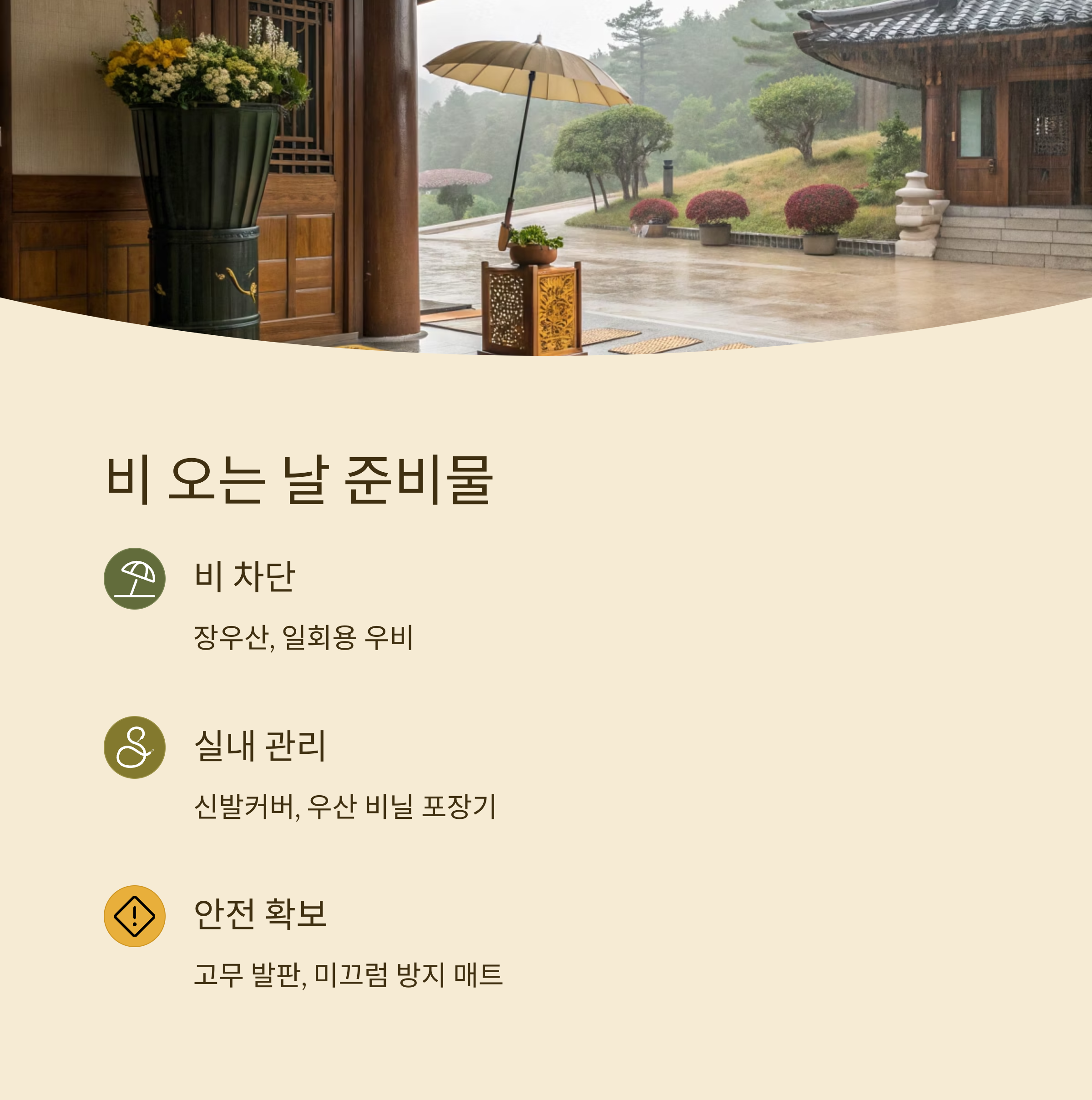 우천 시 바닥이 미끄러워지기 때문에 고무 발판이나 미끄럼 방지 매트를 입구에 설치하는 것이 안전을 위해 꼭 필요해요. 신발커버도 함께 제공하면 장화 없이도 실내 바닥을 오염시키지 않고 이동할 수 있어요.