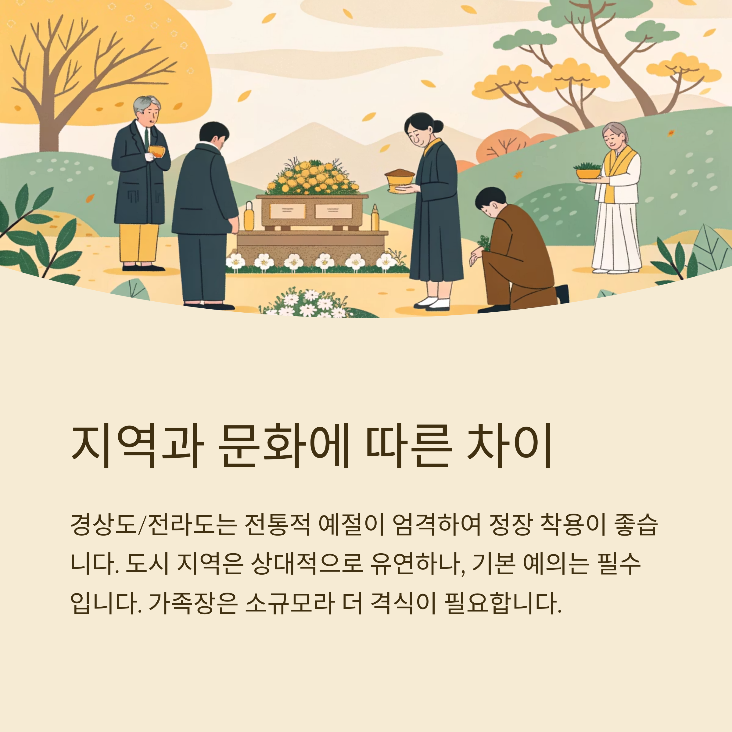 도시나 수도권에서는 상대적으로 유연한 분위기가 많아요. 특히 직장 동료나 지인 장례식의 경우, 반팔 셔츠나 쿨비즈 차림도 일정 수준에서 용인되는 경우가 있어요. 하지만 그럼에도 불구하고 복장이 지나치게 캐주얼하면 눈총을 받을 수 있으니, 기본적인 포멀함은 유지하는 게 좋아요.