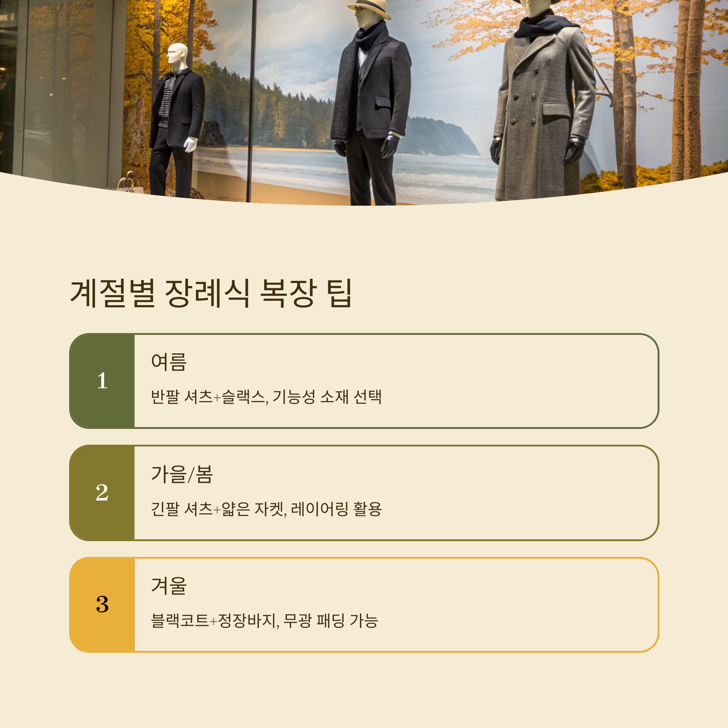 계절별로 조문 복장을 어떻게 선택하면 좋을지 살펴볼게요. 여름에는 무더운 날씨 때문에 시원한 복장을 고민하게 되죠. 반팔 셔츠, 얇은 자켓, 린넨 소재 정장 등 숨쉬기 좋은 원단으로 격식을 유지하면서도 덜 더운 복장을 선택하는 것이 핵심이에요. 특히 구김이 덜 가는 혼방 소재는 실용성도 높아요.