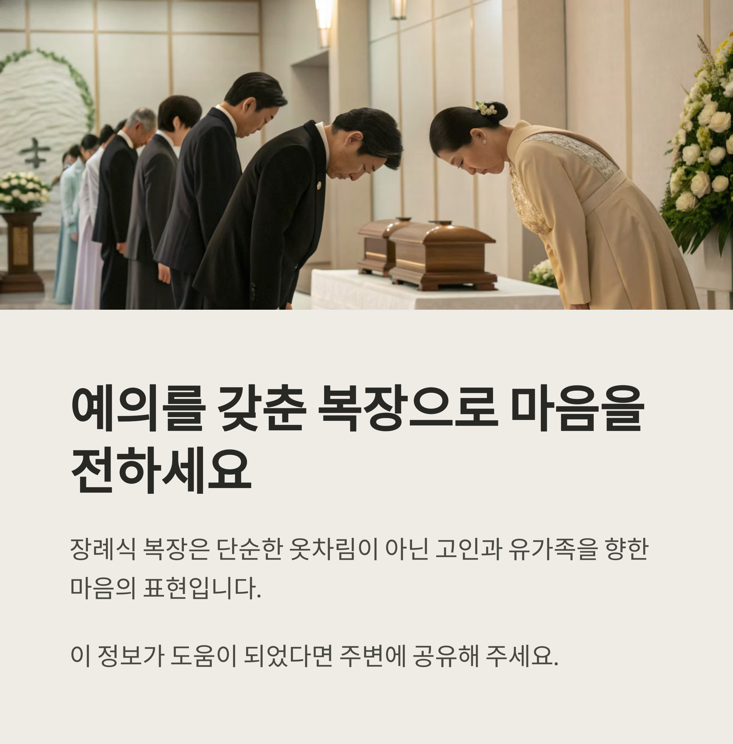 계절이 달라도 복장의 중심은 같아요. '슬픔을 함께한다'는 마음이 잘 드러나도록 조용하고 단정한 복장을 선택하는 것이 가장 중요해요.