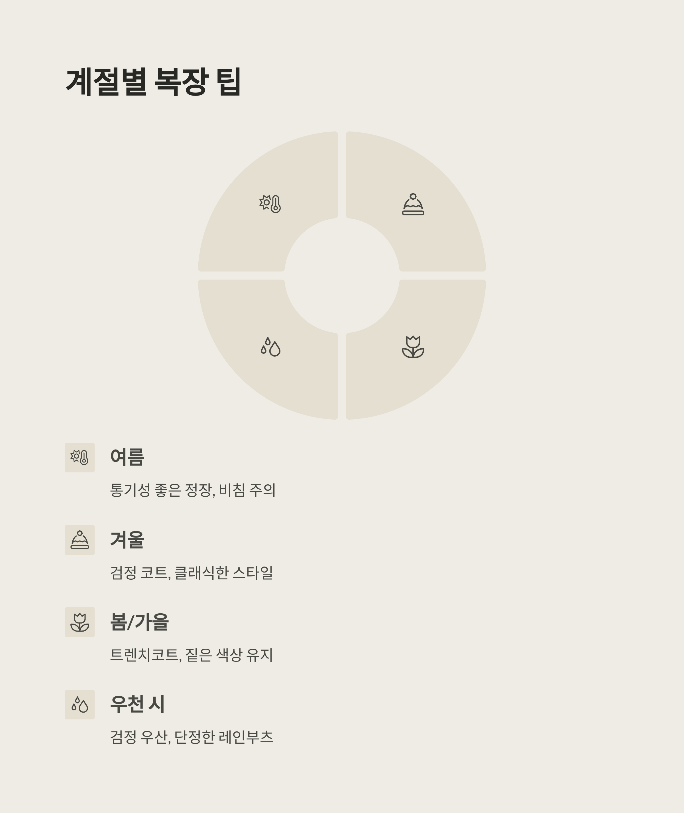 | 겨울 | 검정 코트, 레이어드 정장 | 패딩은 너무 캐주얼 |