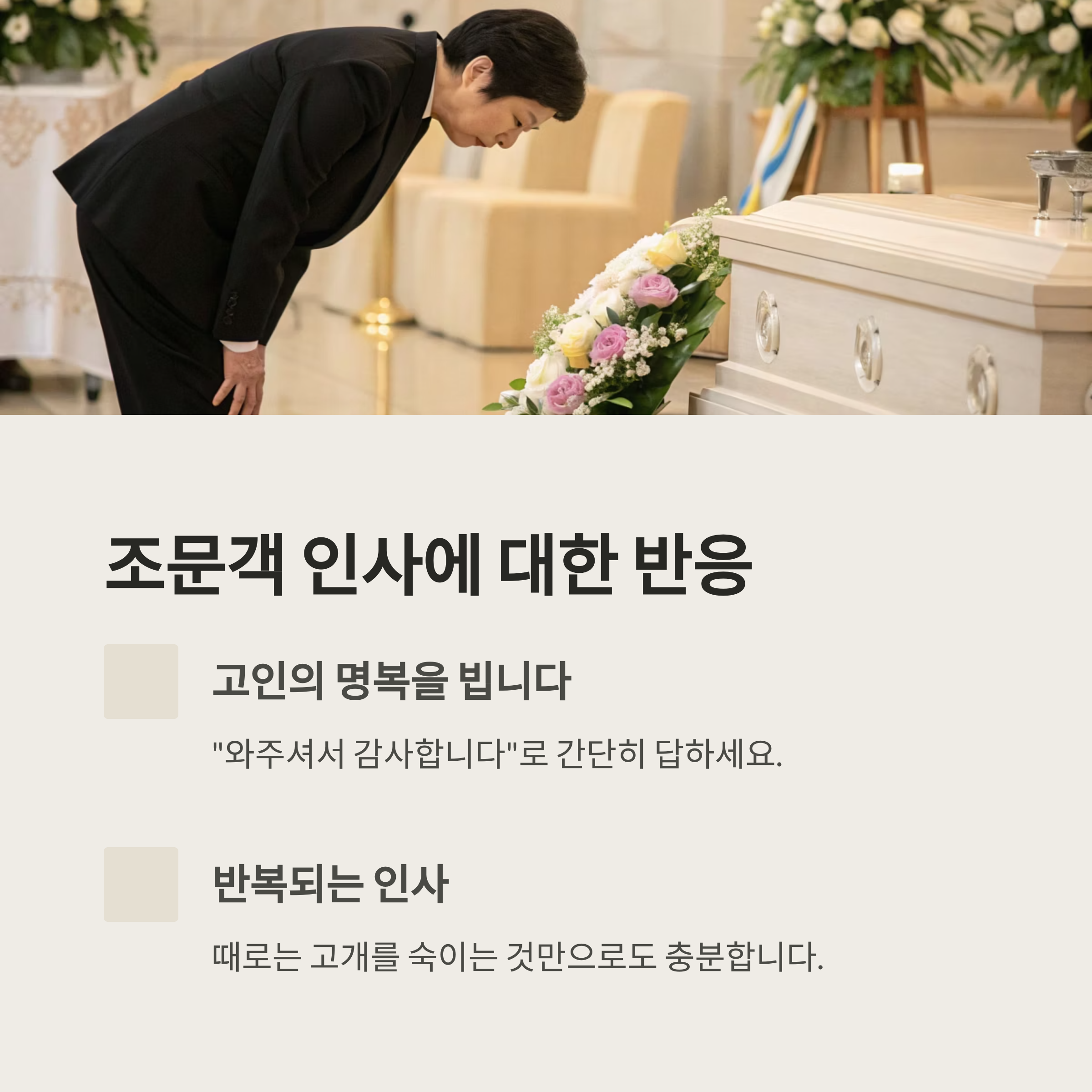 가끔 상주는 눈물만 흘리거나 짧게 고개만 끄덕이는 걸로 답하곤 해요. 그 자체로도 충분한 인사예요. 오히려 말보다는 진심이 담긴 표정과 눈빛에서 더 큰 감사가 전해지기도 하니까요.