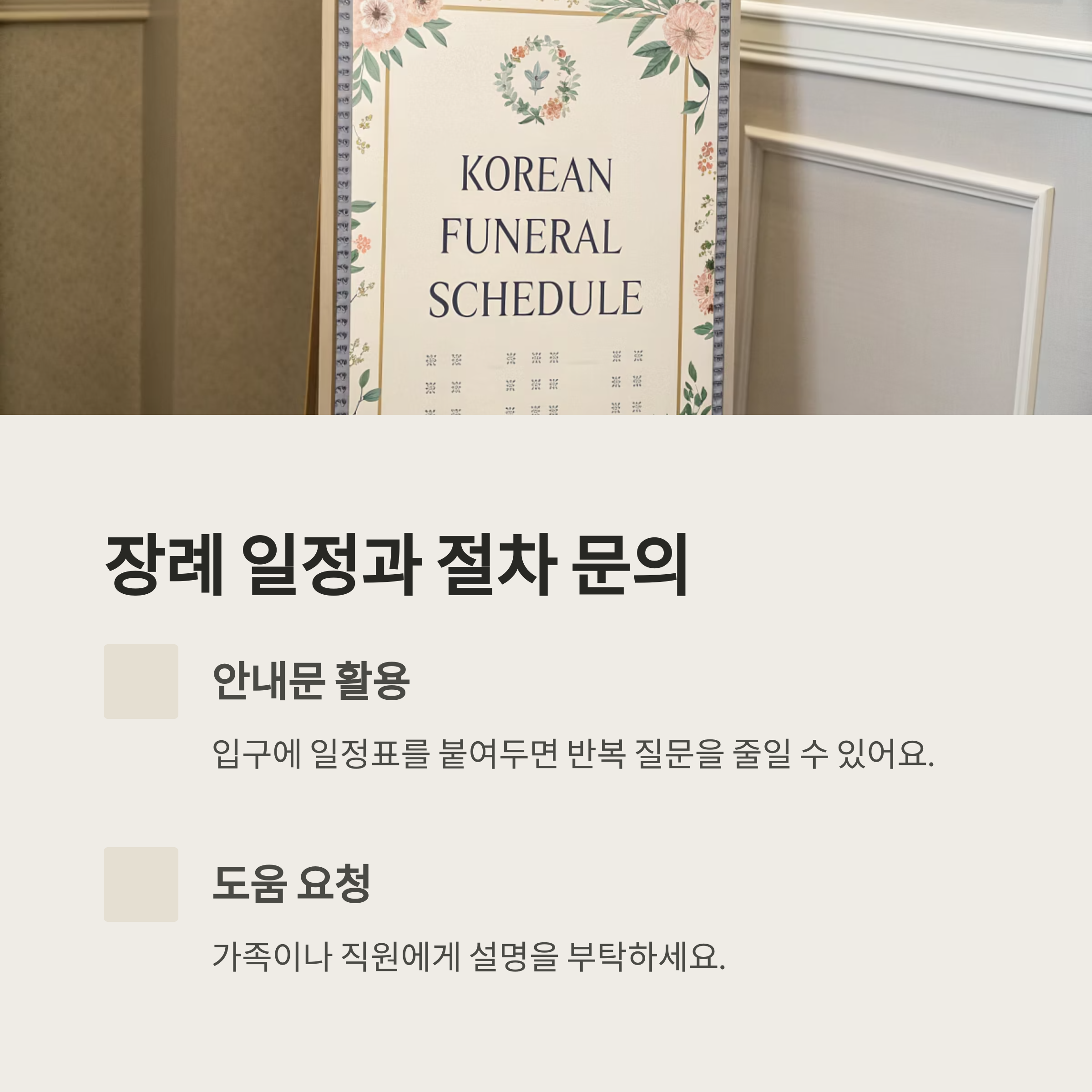 그래서 상주는 입구나 빈소 안쪽에 장례 일정표를 따로 붙여두기도 해요. 또는 주변 가족이나 장례식장 직원이 대신 설명해주는 것도 좋은 방법이에요. 상주 본인은 일정 조율과 감정 정리에 정신이 없는 상태니까요.