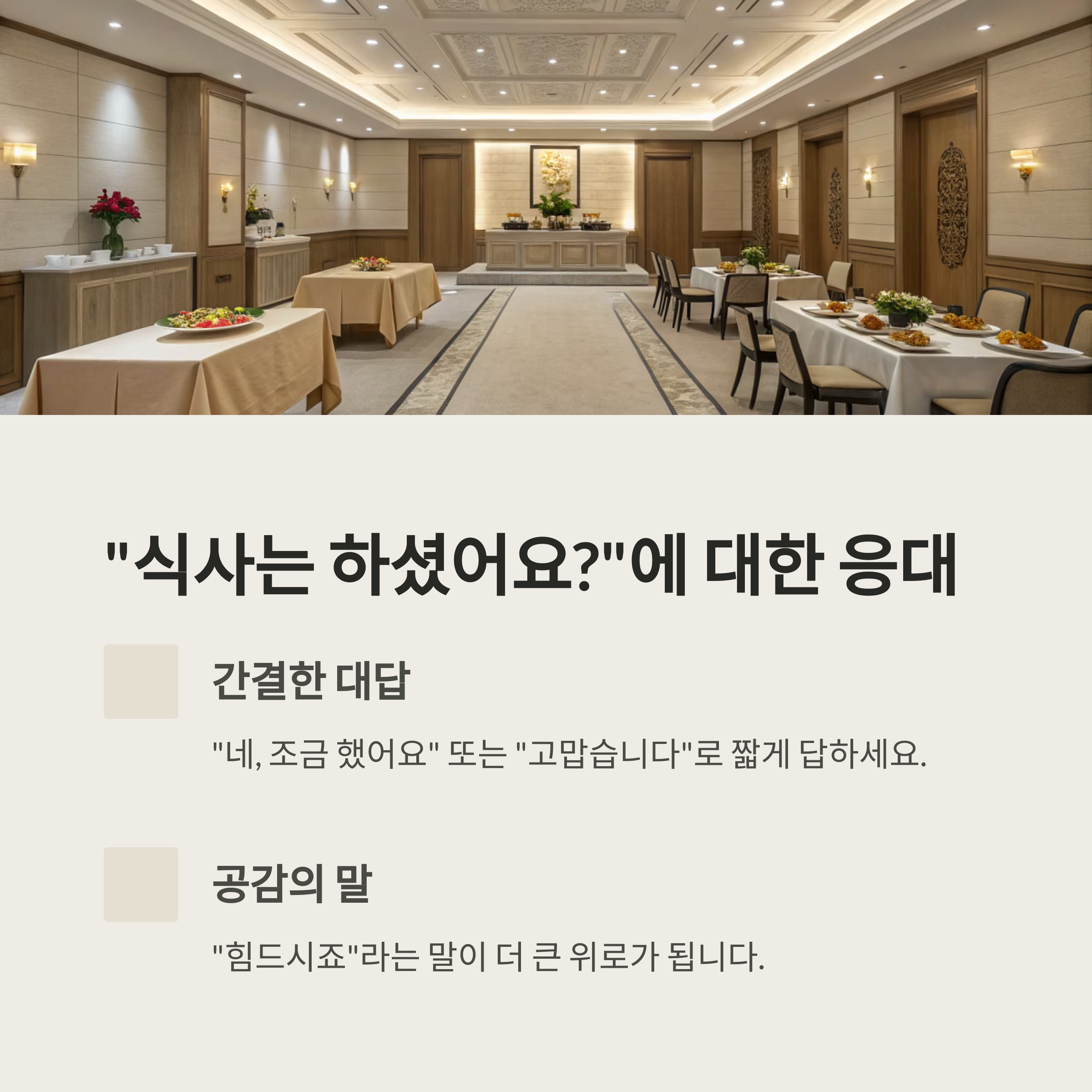 사실 상주는 제대로 식사를 못 하는 경우가 대부분이에요. 마음이 복잡하고 슬픔에 잠겨 있어도 조문객을 맞이하고 장례 절차를 챙겨야 하니까요. 그래서 “예, 조금 했어요” 혹은 “바빠서 아직 못했어요” 같은 짧은 대답으로 넘어가는 경우가 많아요.