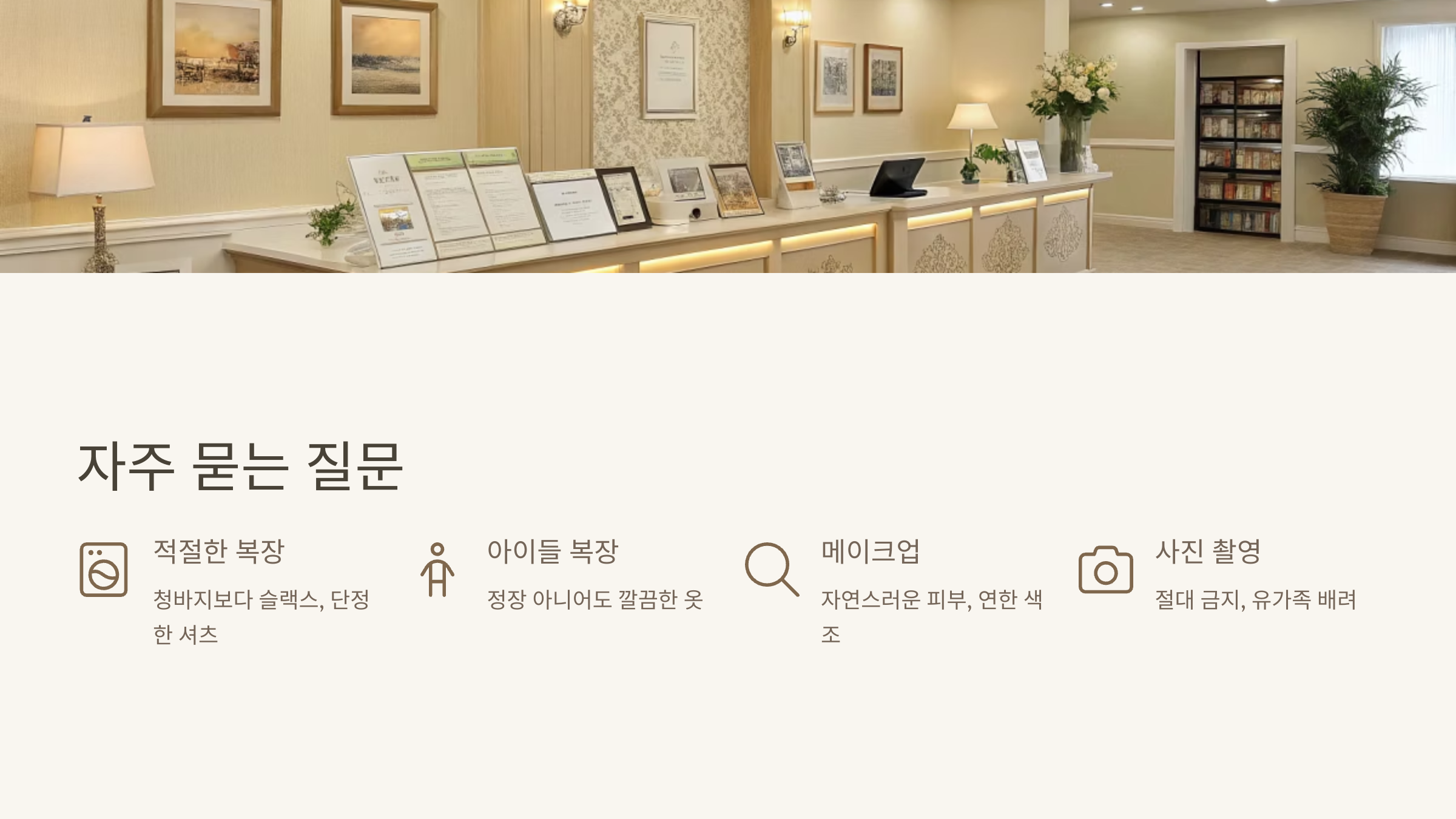 | 아이 | 단정한 톤다운 의상 | 캐릭터 옷, 원색계열 지양 |