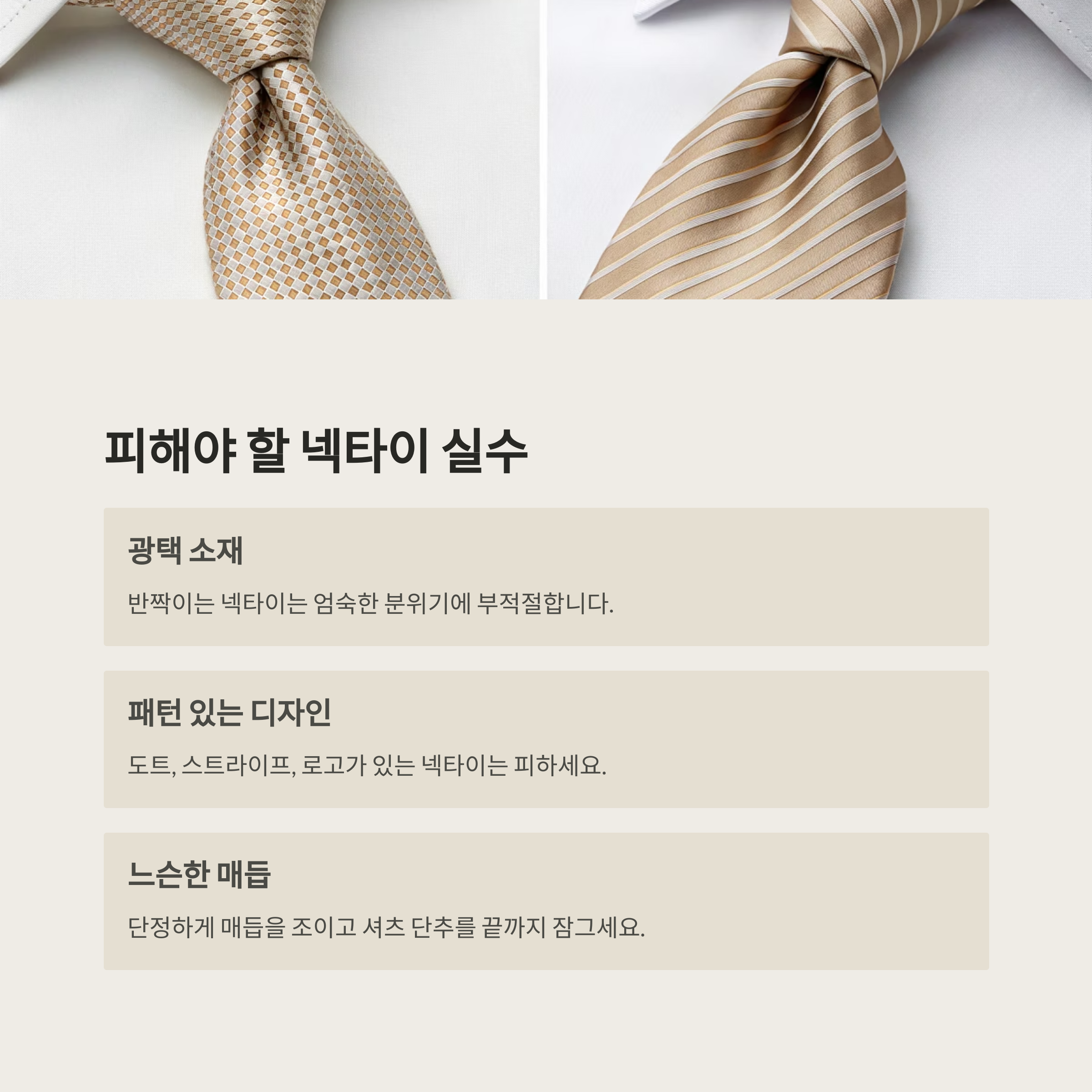 | 광택 넥타이 | 화려함 강조 | 무광 타이 선택 |