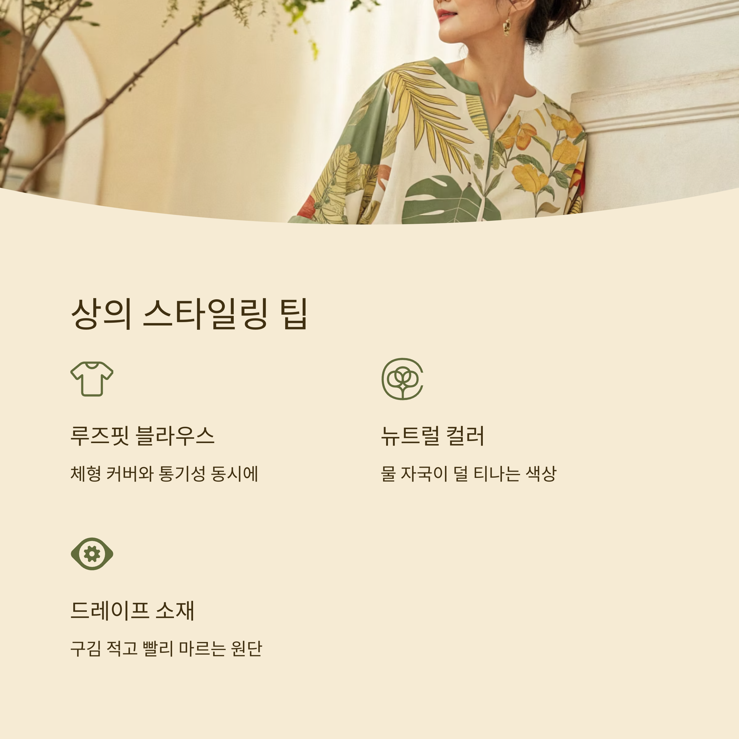 | 루즈핏 블라우스 | 모던&페미닌 | 베이지, 스카이블루 | 슬랙스, 미디스커트 |